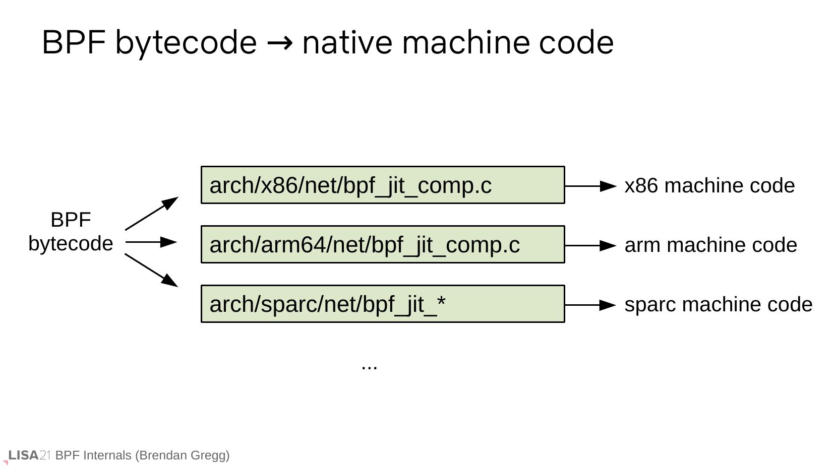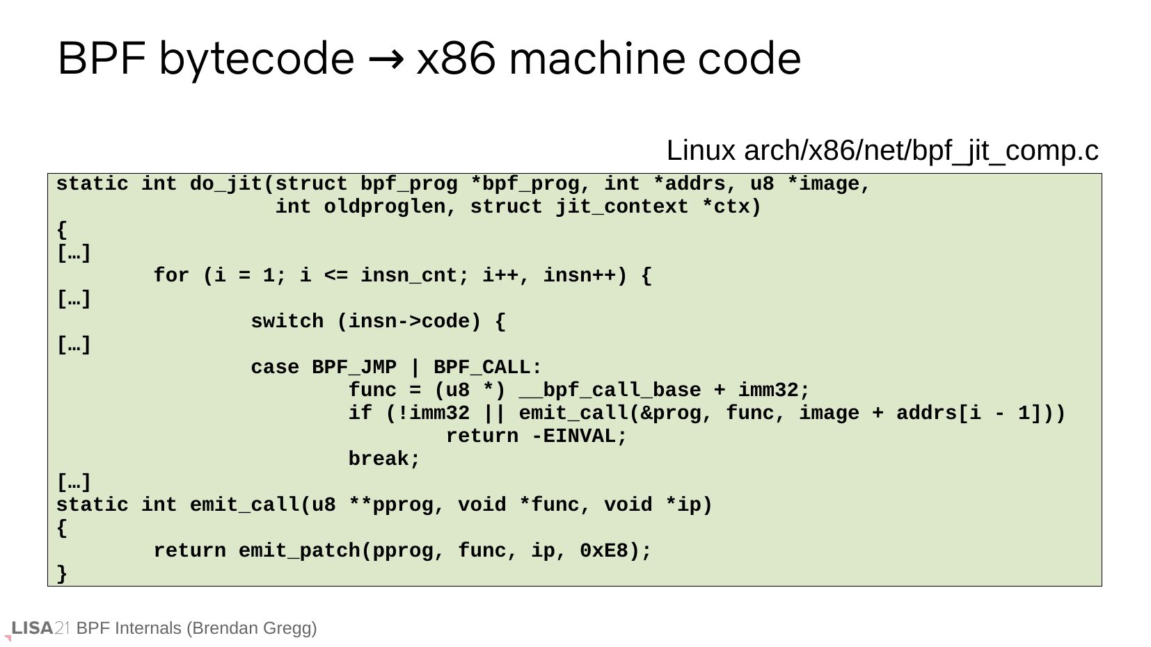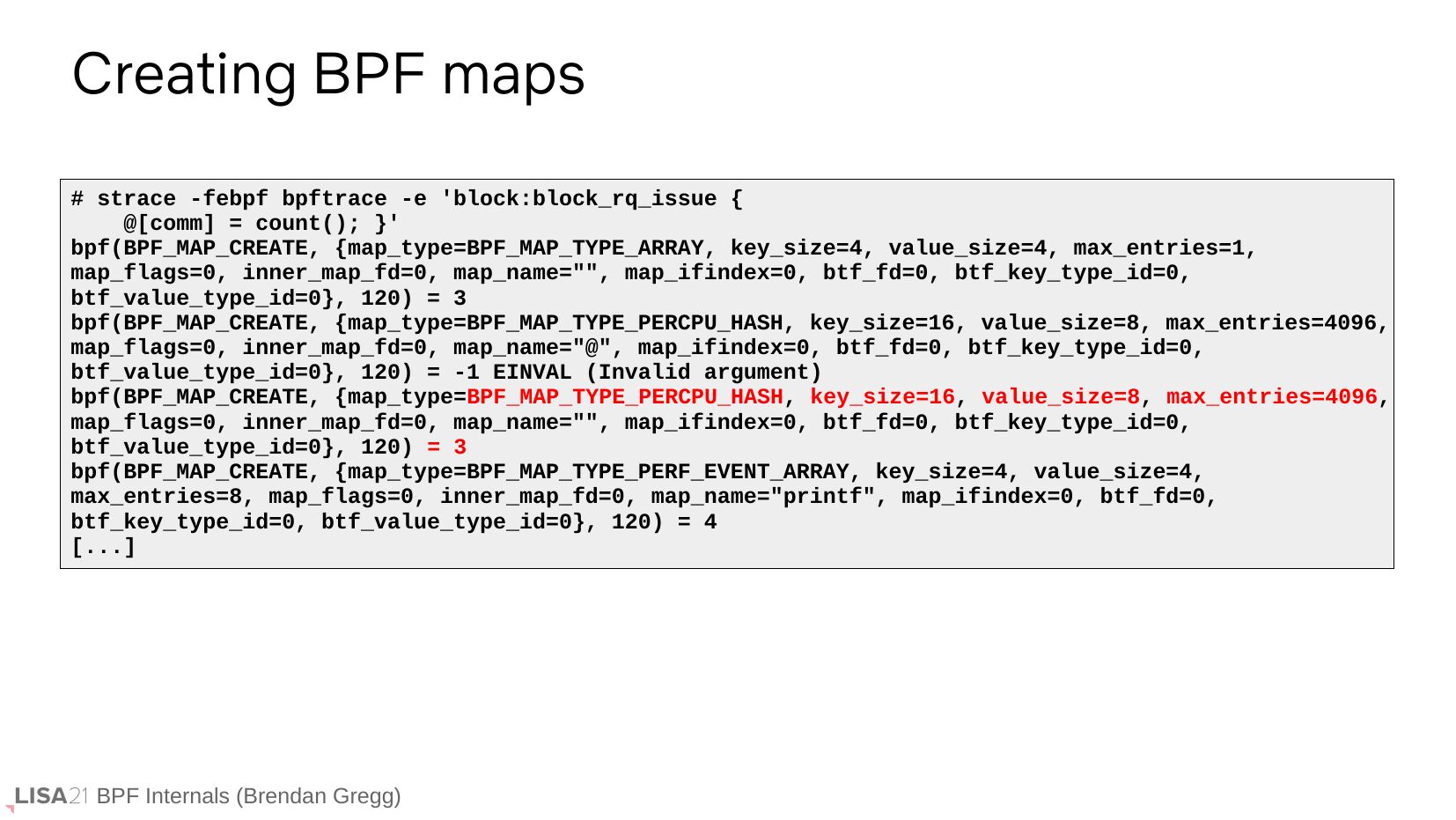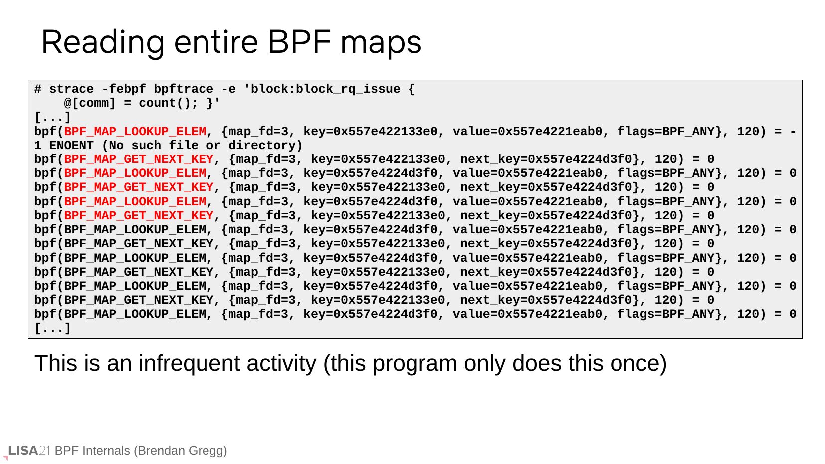 User-space map iteration bpftrace src/bpftrace.cpp int BPFtrace::print_map(IMap &map, uint32_t top, uint32_t div) […] while (bpf_get_next_key(map.mapfd_, old_key.data(), key.data()) == 0) int value_size = map.type_.GetSize(); value_size *= nvalues; auto value = std::vectorgt;(value_size); int err = bpf_lookup_elem(map.mapfd_, key.data(), value.data()); if (err == -1) // key was removed by the eBPF program during bpf_get_next_key() and bpf_lookup_elem(), // let's skip this key continue; else if (err) LOG(ERROR) slide 115: Reading entire BPF maps # strace -febpf bpftrace -e 'block:block_rq_issue { @[comm] = count(); }' [...] bpf(BPF_MAP_LOOKUP_ELEM, {map_fd=3, key=0x557e422133e0, value=0x557e4221eab0, flags=BPF_ANY}, 120) = 1 ENOENT (No such file or directory) bpf(BPF_MAP_GET_NEXT_KEY, {map_fd=3, key=0x557e422133e0, next_key=0x557e4224d3f0}, 120) = 0 bpf(BPF_MAP_LOOKUP_ELEM, {map_fd=3, key=0x557e4224d3f0, value=0x557e4221eab0, flags=BPF_ANY}, 120) = 0 bpf(BPF_MAP_GET_NEXT_KEY, {map_fd=3, key=0x557e422133e0, next_key=0x557e4224d3f0}, 120) = 0 bpf(BPF_MAP_LOOKUP_ELEM, {map_fd=3, key=0x557e4224d3f0, value=0x557e4221eab0, flags=BPF_ANY}, 120) = 0 bpf(BPF_MAP_GET_NEXT_KEY, {map_fd=3, key=0x557e422133e0, next_key=0x557e4224d3f0}, 120) = 0 bpf(BPF_MAP_LOOKUP_ELEM, {map_fd=3, key=0x557e4224d3f0, value=0x557e4221eab0, flags=BPF_ANY}, 120) = 0 bpf(BPF_MAP_GET_NEXT_KEY, {map_fd=3, key=0x557e422133e0, next_key=0x557e4224d3f0}, 120) = 0 bpf(BPF_MAP_LOOKUP_ELEM, {map_fd=3, key=0x557e4224d3f0, value=0x557e4221eab0, flags=BPF_ANY}, 120) = 0 bpf(BPF_MAP_GET_NEXT_KEY, {map_fd=3, key=0x557e422133e0, next_key=0x557e4224d3f0}, 120) = 0 bpf(BPF_MAP_LOOKUP_ELEM, {map_fd=3, key=0x557e4224d3f0, value=0x557e4221eab0, flags=BPF_ANY}, 120) = 0 bpf(BPF_MAP_GET_NEXT_KEY, {map_fd=3, key=0x557e422133e0, next_key=0x557e4224d3f0}, 120) = 0 bpf(BPF_MAP_LOOKUP_ELEM, {map_fd=3, key=0x557e4224d3f0, value=0x557e4221eab0, flags=BPF_ANY}, 120) = 0 [...] This is an infrequent activity (this program only does this once) BPF Internals (Brendan Gregg)slide 116:Final output # bpftrace -e 'tracepoint:block:block_rq_issue { @[comm] = count(); Attaching 1 probe… @[kworker/2:2H]: 131 @[chrome]: 135 @[kworker/7:1H]: 185 @[Xorg]: 245 @[tar]: 1204 @[dmcrypt_write/2]: 1993 BPF Internals (Brendan Gregg)slide 117:Discussion of other internals Stack walking BTF CO-RE Tests raw_tracepoints & fentry Networking & XDP Security & Cgroups BPF Internals (Brendan Gregg)slide 118:BPF tracing/observability high-level recap From: BPF Performance Tools, Figure 2-1 BPF Internals (Brendan Gregg)slide 119:BPF mid-level internals recap From: BPF Performance Tools, Figure 2-3 BPF Internals (Brendan Gregg)slide 120:PSA CONFIG_DEBUG_INFO_BTF=y E.g., Ubuntu 20.10, Fedora 30, and RHEL 8.2 have it BPF Internals (Brendan Gregg)slide 121:References This is also where I recommend you go to learn more: https://events.static.linuxfound.org/sites/events/files/slides/ bpf_collabsummit_2015feb20.pdf Linux include/uapi/linux/bpf_common.h Linux include/uapi/linux/bpf.h Linux include/uapi/linux/filter.h https://docs.cilium.io/en/v1.9/bpf/#bpf-guide BPF Performance Tools, Addison-Wesley 2020 https://ebpf.io/what-is-ebpf http://www.brendangregg.com/ebpf.html https://github.com/iovisor/bcc https://github.com/iovisor/bpftrace BPF Internals (Brendan Gregg)slide 122:Thanks BPF: Alexei Starovoitov (Facebook), Daniel Borkmann (Isovalent), David S. Miller (Red Hat), Jakub Kicinski (Facebook), Yonghong Song (Facebook), Martin KaFai Lau (Facebook), John Fastabend (Isovalent), Quentin Monnet (Isovalent), Jesper Dangaard Brouer (Red Hat), Andrey Ignatov (Facebook), and Stanislav Fomichev (Google), Linus Torvalds, and many more in the BPF community LLVM BPF: Alexei Starovoitov, Chandler Carruth (Google), Yonghong Song, and more bpftrace: Alastair Robertson (Yellowbrick Data), Dan Xu (Facebook), Bas Smit, Mary Marchini (Netflix), Masanori Misono, Jiri Olsa, Viktor Malík, Dale Hamel, Willian Gaspar, Augusto Mecking Caringi, and many more in the bpftrace community USENIX https://ebpf.io Jun, 2021 BPF Internals (Brendan Gregg)