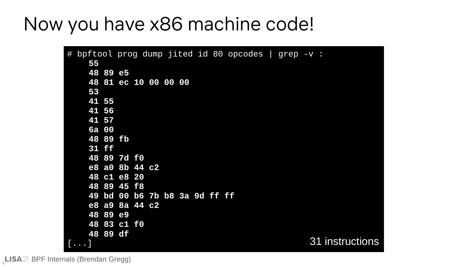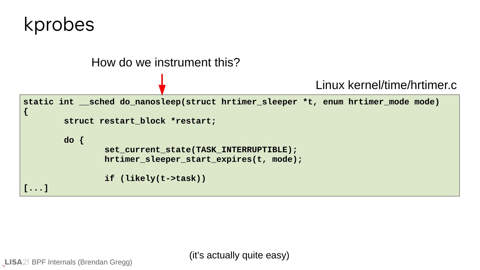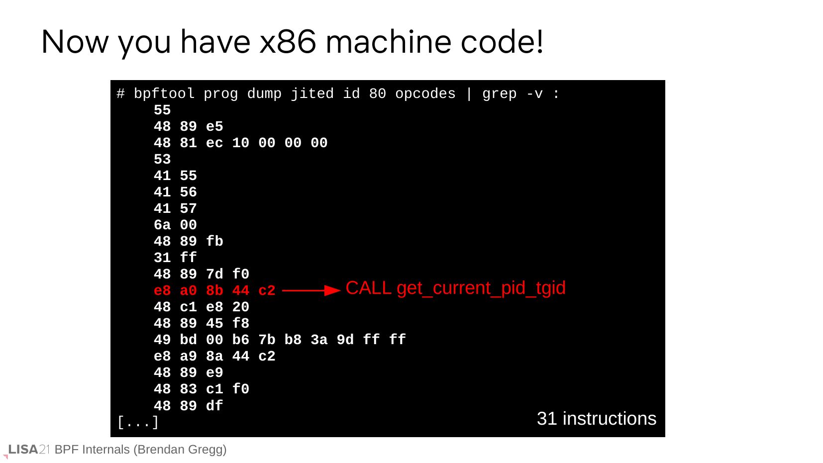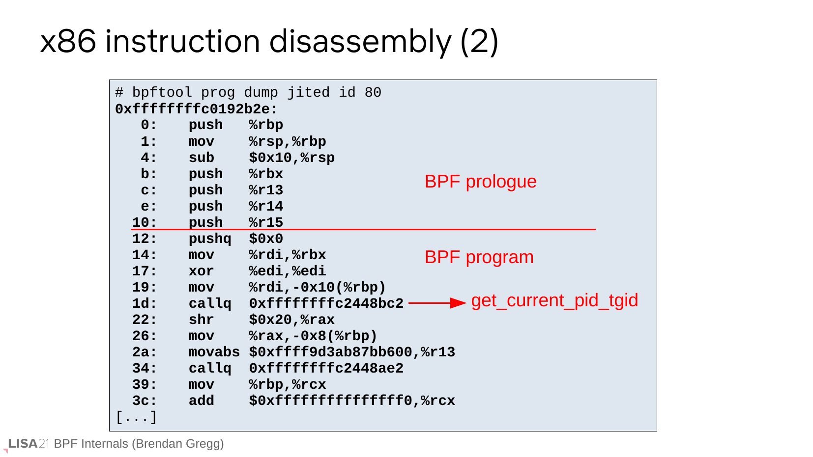 slide 89:Instrumenting live kernel functions (gdb) disas/r do_nanosleep Dump of assembler code for function do_nanosleep: 0xffffffff81b7d810slide 90:gt;: e8 1b 00 4f ff callq 0xffffffff81b7d815 gt;: push 0xffffffff81b7d816 gt;: 89 f1 mov 0xffffffff81b7d818 gt;: 48 89 e5 mov 0xffffffff81b7d81b gt;: 41 55 push 0xffffffff81b7d81d gt;: 41 54 push 0xffffffff81b7d81f gt;: 53 push [...] BPF Internals (Brendan Gregg) 0xffffffff8106d830 gt; %rbp %esi,%ecx %rsp,%rbp %r13 %r12 %rbx