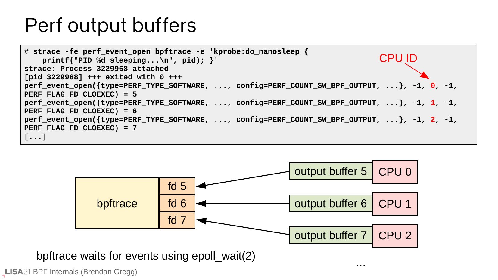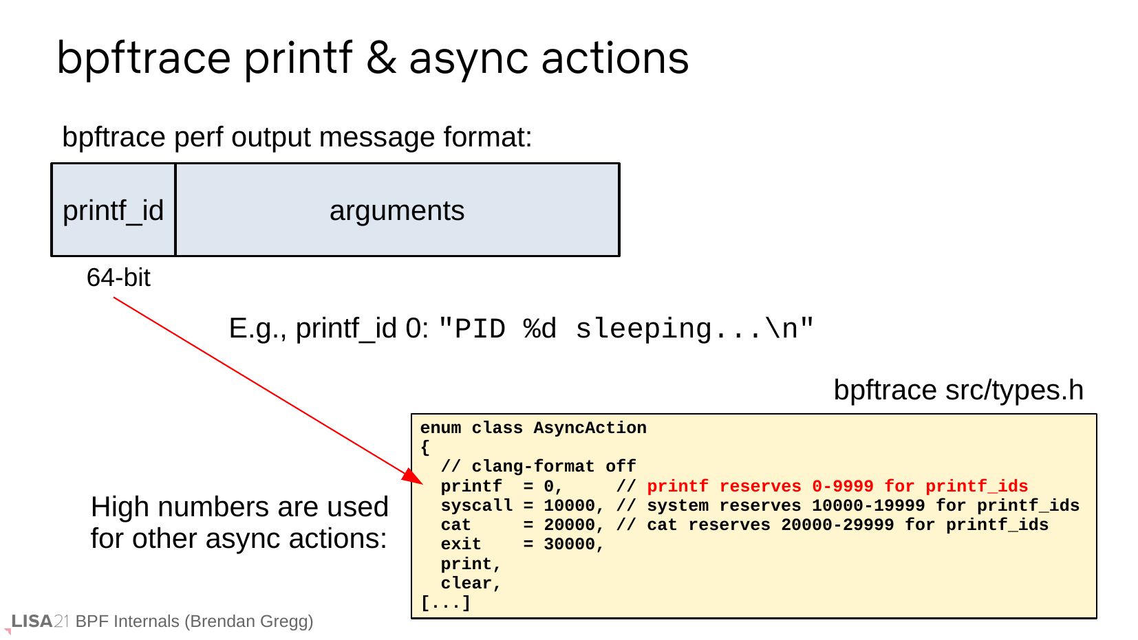 bpftrace printf & async actions bpftrace perf output message format: printf_id arguments 64-bit E.g., printf_id 0: "PID %d sleeping...\n" bpftrace src/types.h High numbers are used for other async actions: BPF Internals (Brendan Gregg) enum class AsyncAction // clang-format off printf = 0, // printf reserves 0-9999 for printf_ids syscall = 10000, // system reserves 10000-19999 for printf_ids cat = 20000, // cat reserves 20000-29999 for printf_ids exit = 30000, print, clear, [...]slide 96:
