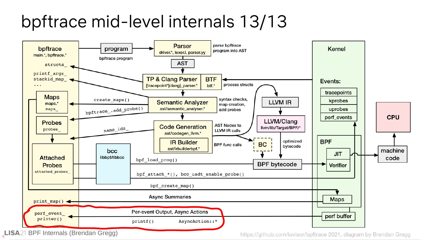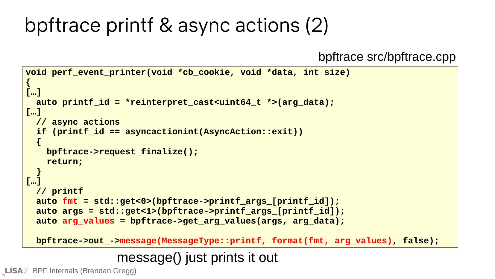 bpftrace printf & async actions (2) bpftrace src/bpftrace.cpp void perf_event_printer(void *cb_cookie, void *data, int size) […] auto printf_id = *reinterpret_castslide 97:gt;(arg_data); […] // async actions if (printf_id == asyncactionint(AsyncAction::exit)) bpftrace->gt;request_finalize(); return; […] // printf auto fmt = std::get gt;(bpftrace->gt;printf_args_[printf_id]); auto args = std::get gt;(bpftrace->gt;printf_args_[printf_id]); auto arg_values = bpftrace->gt;get_arg_values(args, arg_data); bpftrace->gt;out_->gt;message(MessageType::printf, format(fmt, arg_values), false); message() just prints it out BPF Internals (Brendan Gregg)