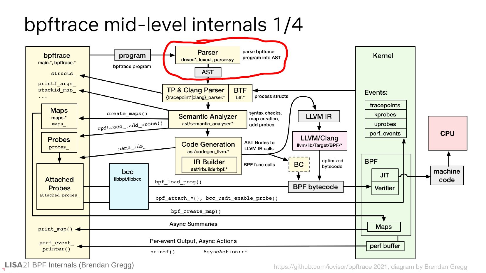 slide 26:Parsing bpftrace bpftrace program text src/lexer.l (regular expressions) src/parser.yy (grammer) lex yacc (very easy) BPF Internals (Brendan Gregg) ASTslide 27: