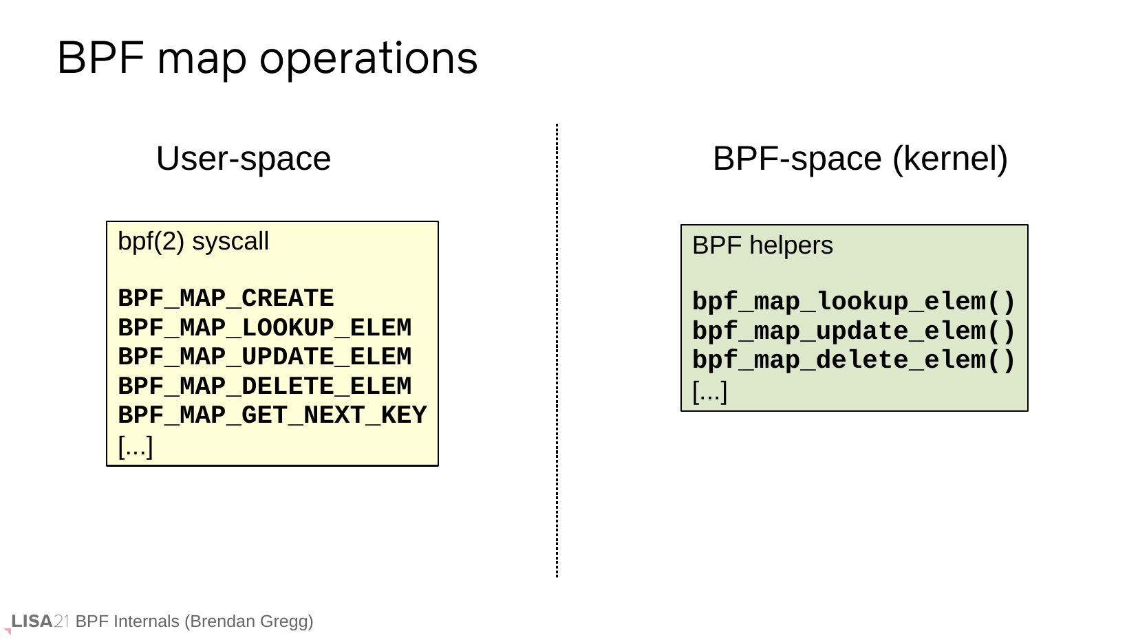 BPF map operations User-space BPF-space (kernel) bpf(2) syscall BPF helpers BPF_MAP_CREATE BPF_MAP_LOOKUP_ELEM BPF_MAP_UPDATE_ELEM BPF_MAP_DELETE_ELEM BPF_MAP_GET_NEXT_KEY [...] bpf_map_lookup_elem() bpf_map_update_elem() bpf_map_delete_elem() [...] BPF Internals (Brendan Gregg)slide 106: