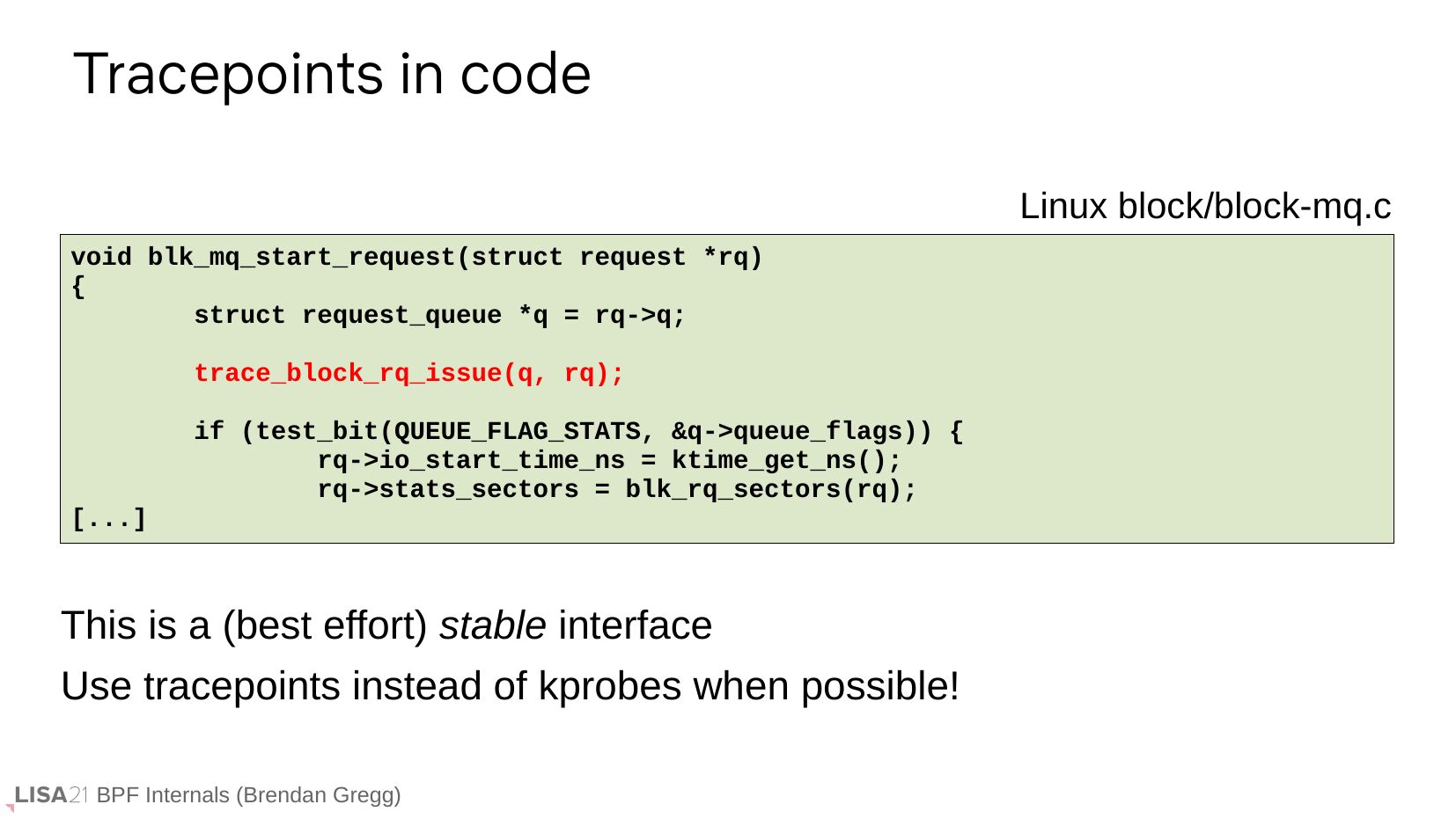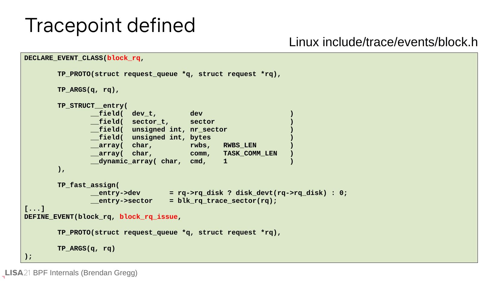 Tracepoint defined Linux include/trace/events/block.h DECLARE_EVENT_CLASS(block_rq, TP_PROTO(struct request_queue *q, struct request *rq), TP_ARGS(q, rq), If ... TP_STRUCT__entry( __field( dev_t, dev __field( sector_t, sector __field( unsigned int, nr_sector __field( unsigned int, bytes __array( char, rwbs, RWBS_LEN __array( char, comm, TASK_COMM_LEN __dynamic_array( char, cmd, TP_fast_assign( __entry->gt;dev __entry->gt;sector = rq->gt;rq_disk ? disk_devt(rq->gt;rq_disk) : 0; = blk_rq_trace_sector(rq); [...] DEFINE_EVENT(block_rq, block_rq_issue, TP_PROTO(struct request_queue *q, struct request *rq), TP_ARGS(q, rq) BPF Internals (Brendan Gregg)slide 110: