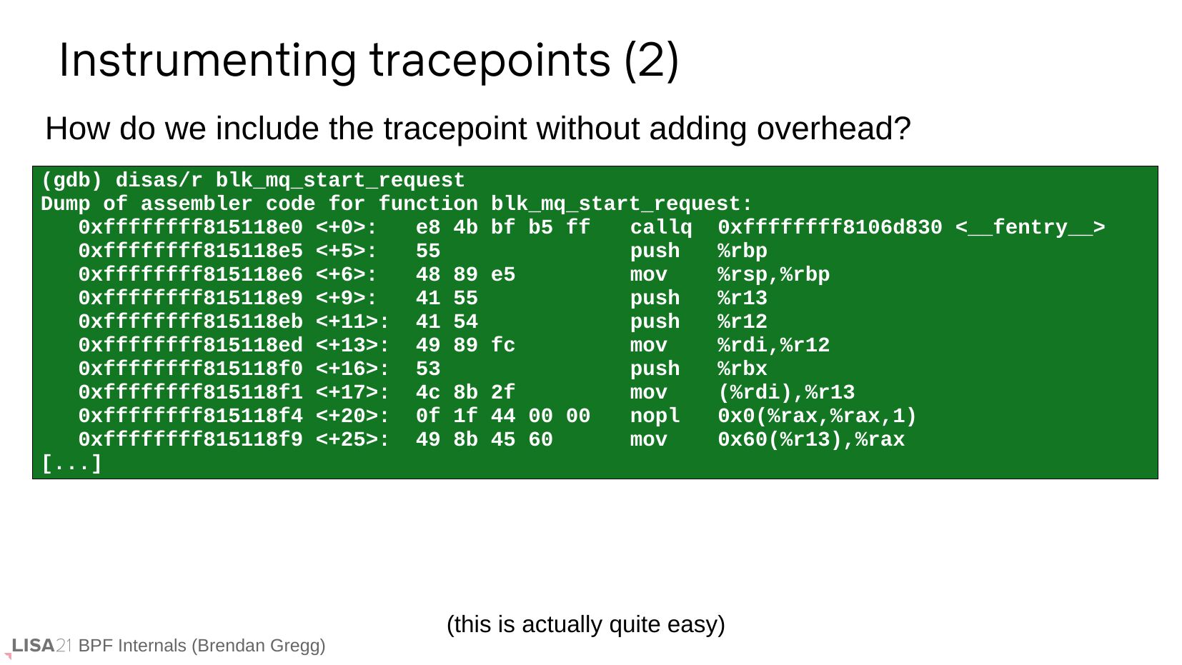 slide 111:Instrumenting tracepoints (2) How do we include the tracepoint without adding overhead? (gdb) disas/r blk_mq_start_request Dump of assembler code for function blk_mq_start_request: 0xffffffff815118e0slide 112:gt;: e8 4b bf b5 ff callq 0xffffffff8106d830 gt; 0xffffffff815118e5 gt;: push %rbp 0xffffffff815118e6 gt;: 48 89 e5 mov %rsp,%rbp 0xffffffff815118e9 gt;: 41 55 push %r13 0xffffffff815118eb gt;: 41 54 push %r12 0xffffffff815118ed gt;: 49 89 fc mov %rdi,%r12 0xffffffff815118f0 gt;: 53 push %rbx 0xffffffff815118f1 gt;: 4c 8b 2f mov (%rdi),%r13 0xffffffff815118f4 gt;: 0f 1f 44 00 00 nopl 0x0(%rax,%rax,1) 0xffffffff815118f9 gt;: 49 8b 45 60 mov 0x60(%r13),%rax [...] BPF Internals (Brendan Gregg) (this is actually quite easy)