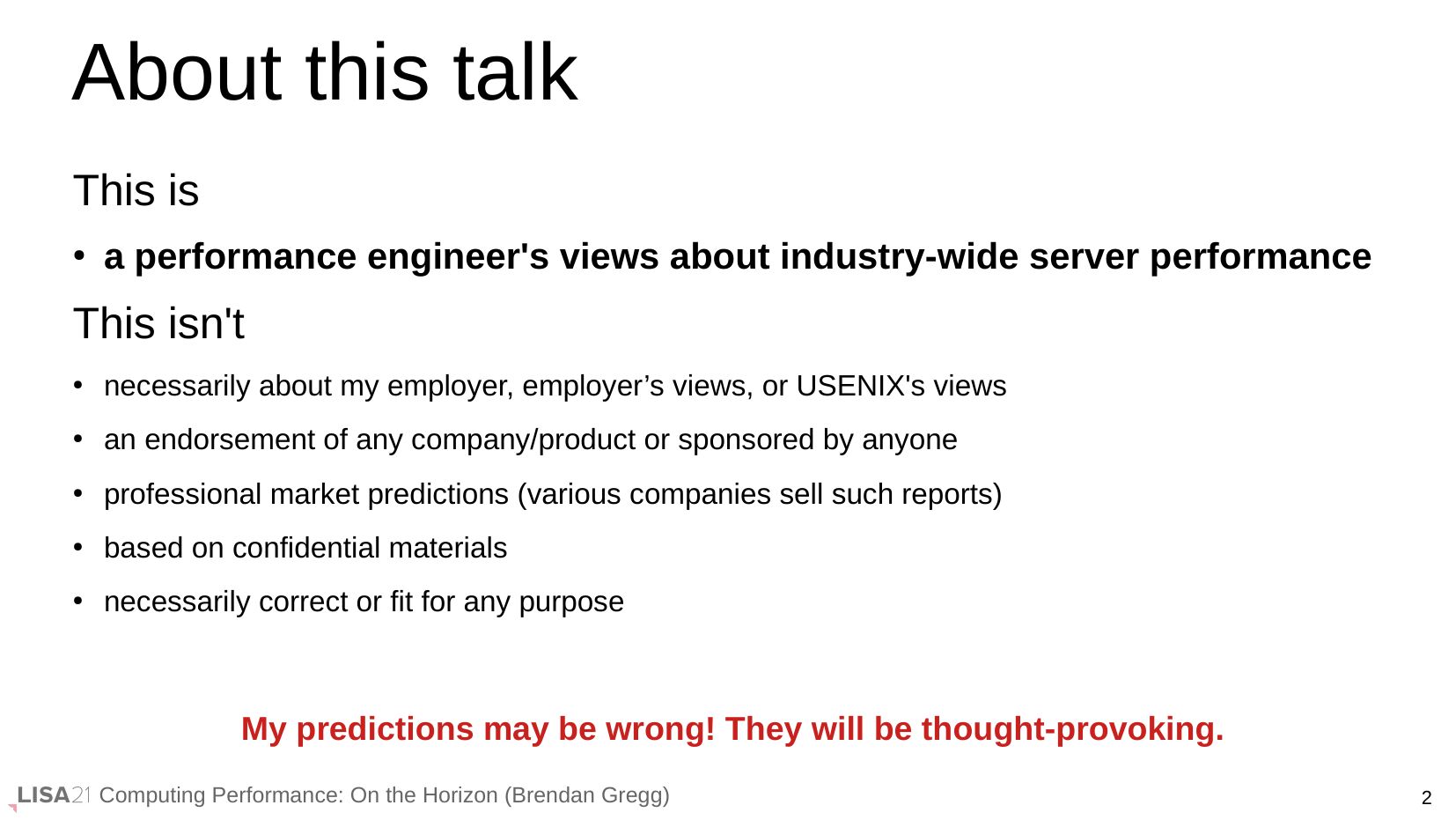 About this talk This is a performance engineer's views about industry-wide server performance This isn't necessarily about my employer, employer’s views, or USENIX's views an endorsement of any company/product or sponsored by anyone professional market predictions (various companies sell such reports) based on confidential materials necessarily correct or fit for any purpose My predictions may be wrong! They will be thought-provoking. Computing Performance: On the Horizon (Brendan Gregg)slide 3: