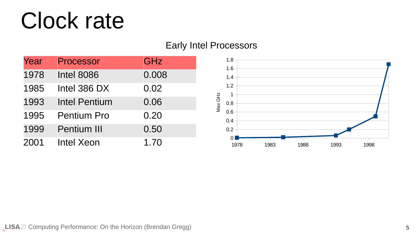Clock rate Early Intel Processors Processor Intel 8086 Intel 386 DX Intel Pentium Pentium Pro Pentium III Intel Xeon GHz Computing Performance: On the Horizon (Brendan Gregg) Max GHz Yearslide 6: