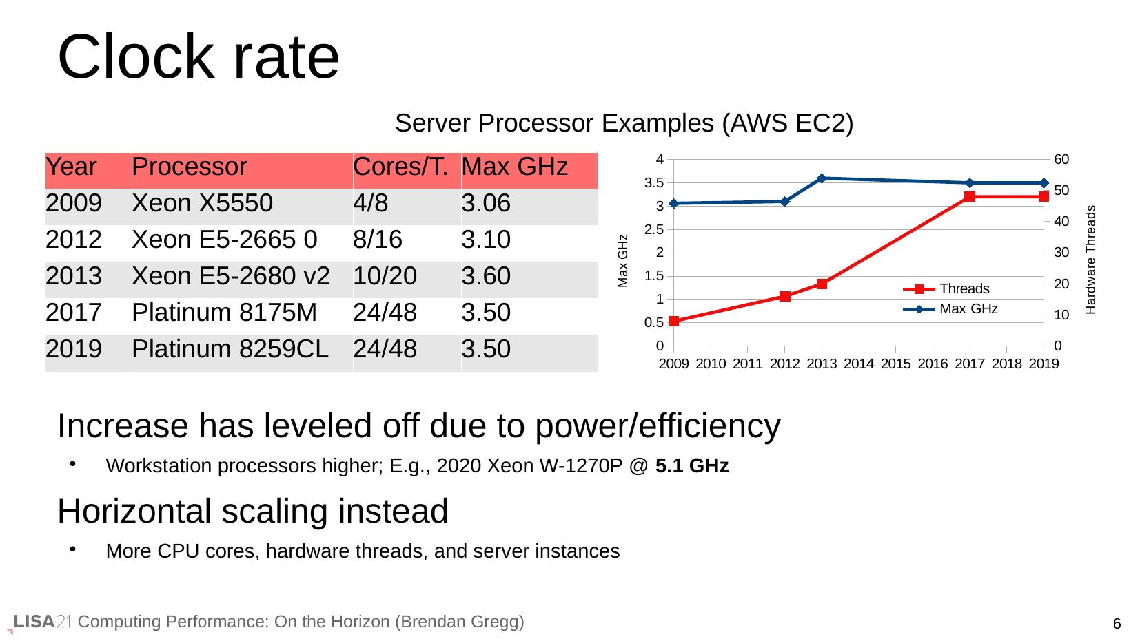 Clock rate Server Processor Examples (AWS EC2) Cores/T. Max GHz 4/8 8/16 10/20 24/48 24/48 Threads Max GHz Hardware Threads Processor Xeon X5550 Xeon E5-2665 0 Xeon E5-2680 v2 Platinum 8175M Platinum 8259CL Max GHz Year 2009 2010 2011 2012 2013 2014 2015 2016 2017 2018 2019 Increase has leveled off due to power/efficiency Workstation processors higher; E.g., 2020 Xeon W-1270P @ 5.1 GHz Horizontal scaling instead More CPU cores, hardware threads, and server instances Computing Performance: On the Horizon (Brendan Gregg)slide 7:
