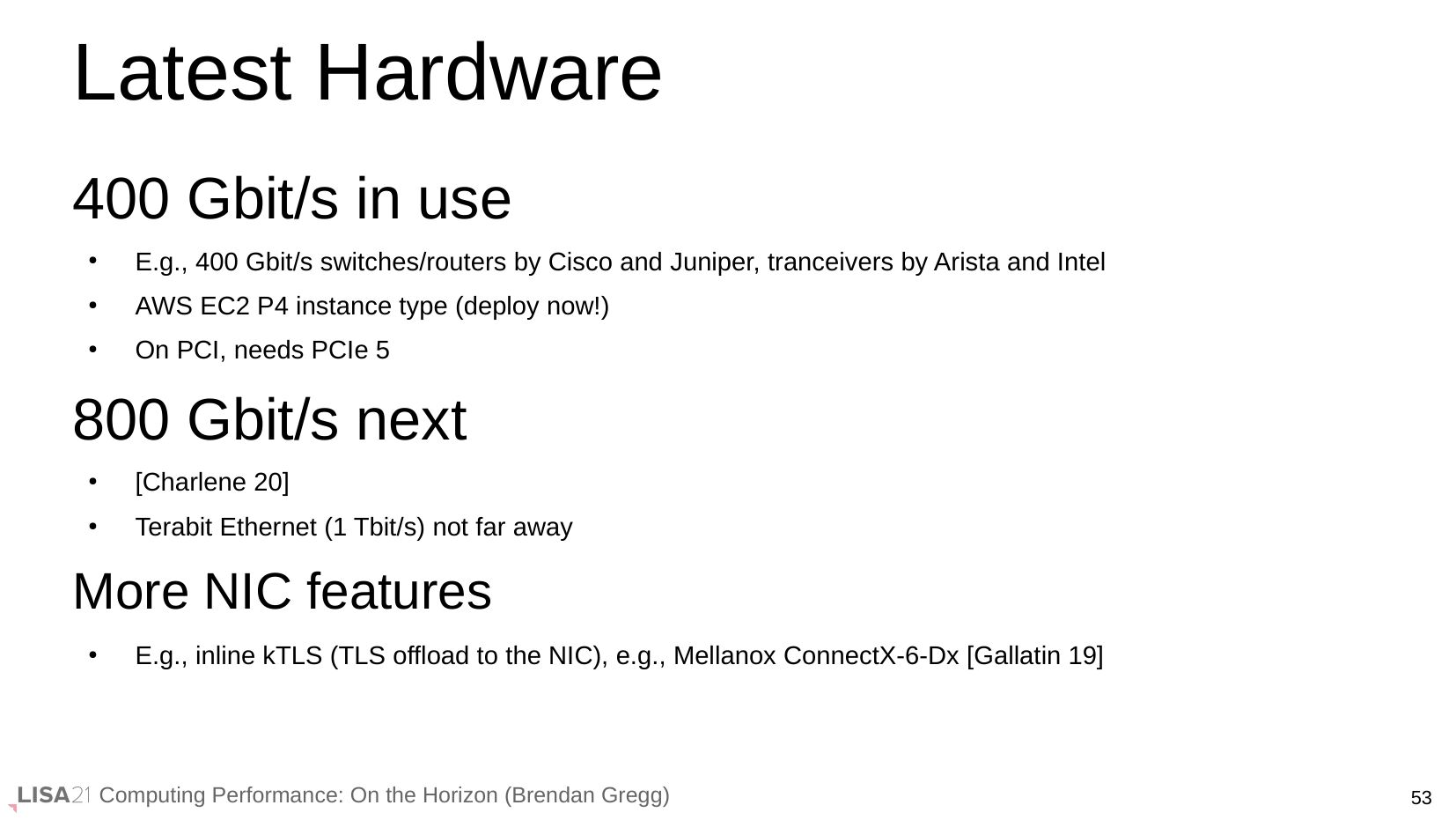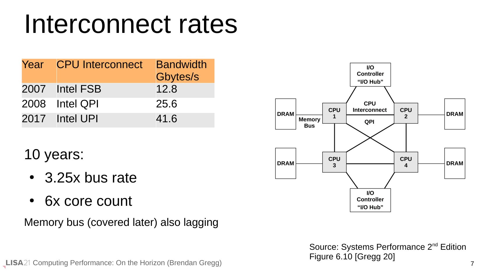 Interconnect rates Year CPU Interconnect 2007 Intel FSB 2008 Intel QPI 2017 Intel UPI Bandwidth Gbytes/s 10 years: 3.25x bus rate 6x core count Memory bus (covered later) also lagging Computing Performance: On the Horizon (Brendan Gregg) Source: Systems Performance 2nd Edition Figure 6.10 [Gregg 20]slide 8: