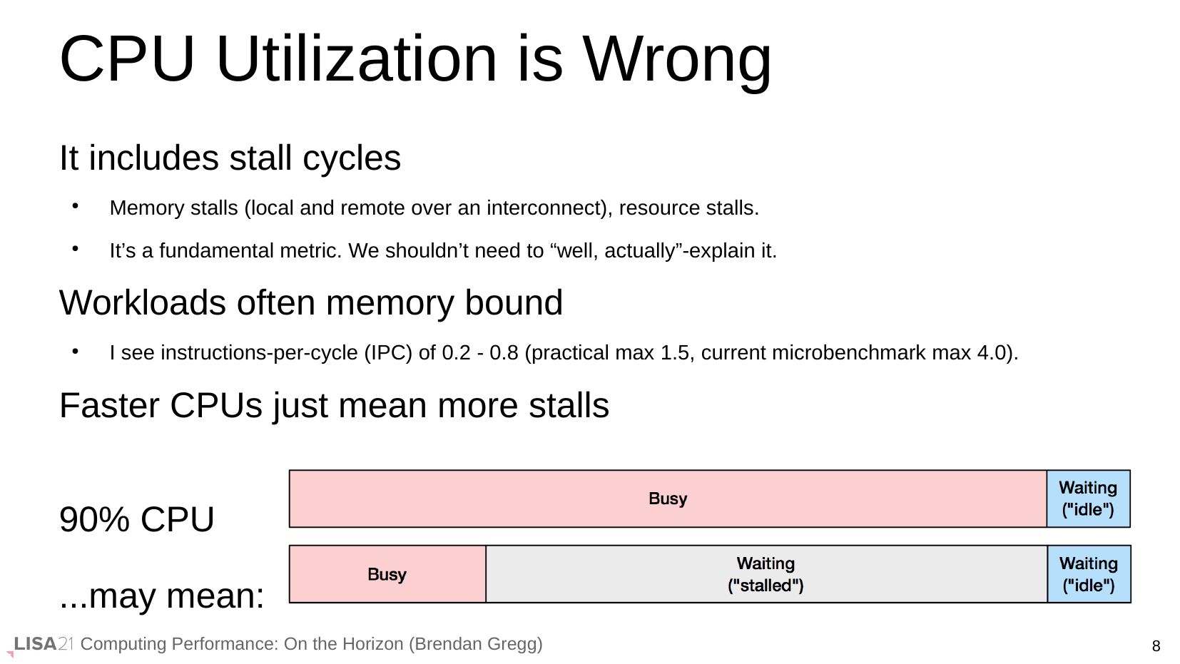 CPU Utilization is Wrong It includes stall cycles Memory stalls (local and remote over an interconnect), resource stalls. It’s a fundamental metric. We shouldn’t need to “well, actually”-explain it. Workloads often memory bound I see instructions-per-cycle (IPC) of 0.2 - 0.8 (practical max 1.5, current microbenchmark max 4.0). Faster CPUs just mean more stalls 90% CPU ...may mean: Computing Performance: On the Horizon (Brendan Gregg)slide 9: