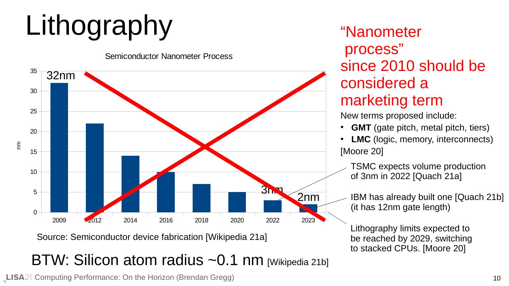 Lithography Semiconductor Nanometer Process 32nm TSMC expects volume production of 3nm in 2022 [Quach 21a] 3nm 2nm IBM has already built one [Quach 21b] Source: Semiconductor device fabrication [Wikipedia 21a] BTW: Silicon atom radius ~0.1 nm [Wikipedia 21b] Computing Performance: On the Horizon (Brendan Gregg) Lithography limits expected to be reached by 2029, switching to stacked CPUs. [Moore 20]slide 10: