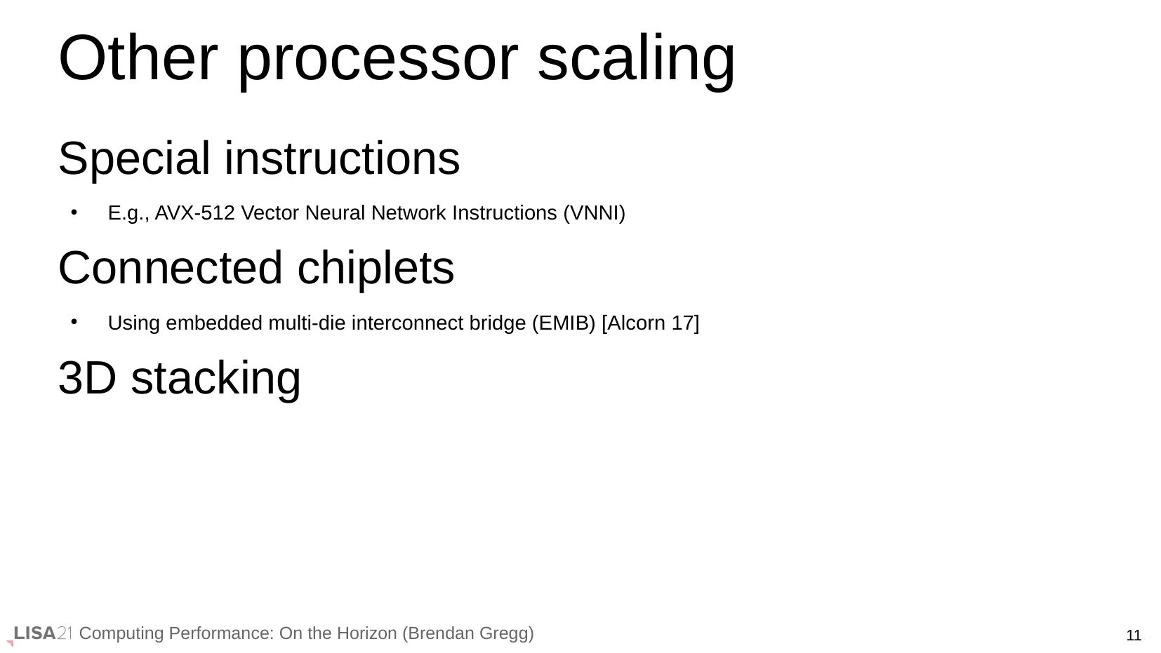 Other processor scaling Special instructions E.g., AVX-512 Vector Neural Network Instructions (VNNI) Connected chiplets Using embedded multi-die interconnect bridge (EMIB) [Alcorn 17] 3D stacking Computing Performance: On the Horizon (Brendan Gregg)slide 12: