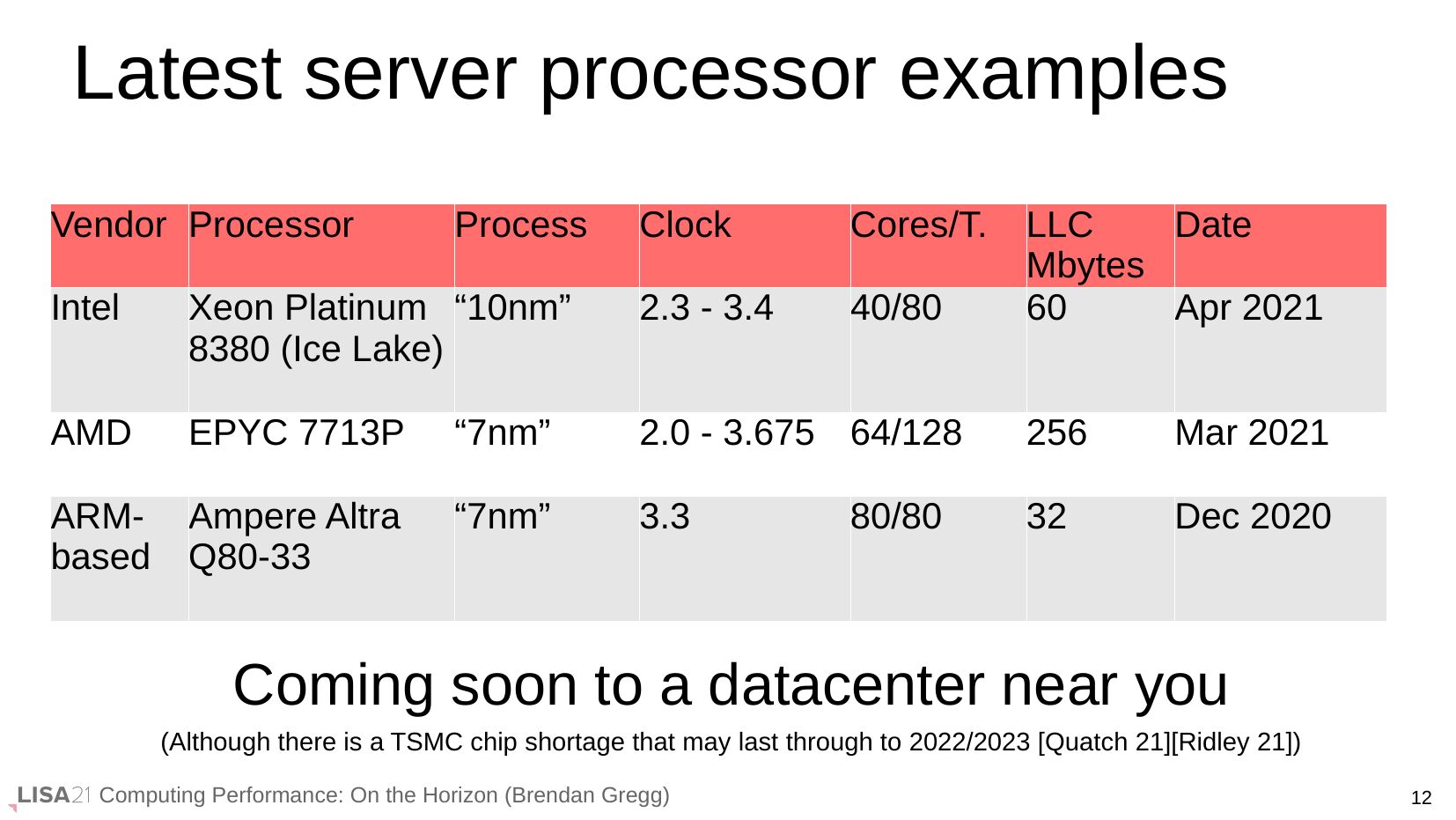Latest server processor examples Vendor Processor Process Clock Cores/T. 40/80 LLC Date Mbytes Apr 2021 Intel Xeon Platinum “10nm” 8380 (Ice Lake) 2.3 - 3.4 AMD EPYC 7713P “7nm” 2.0 - 3.675 64/128 Mar 2021 ARMbased Ampere Altra Q80-33 “7nm” Dec 2020 80/80 Coming soon to a datacenter near you (Although there is a TSMC chip shortage that may last through to 2022/2023 [Quatch 21][Ridley 21]) Computing Performance: On the Horizon (Brendan Gregg)slide 13:
