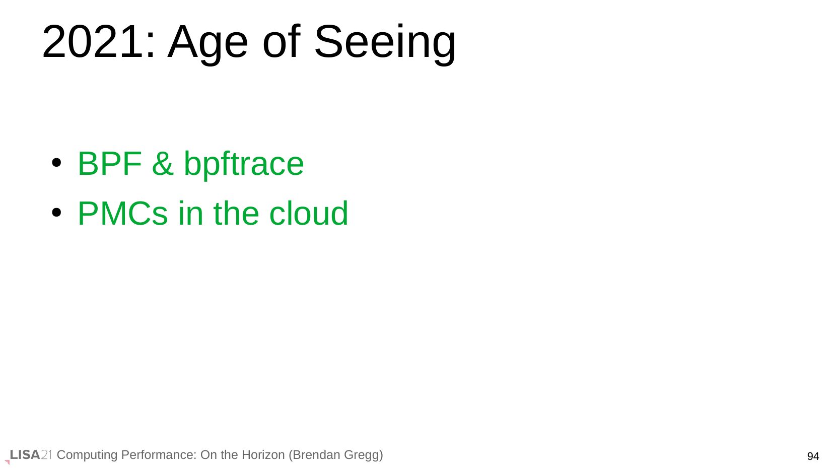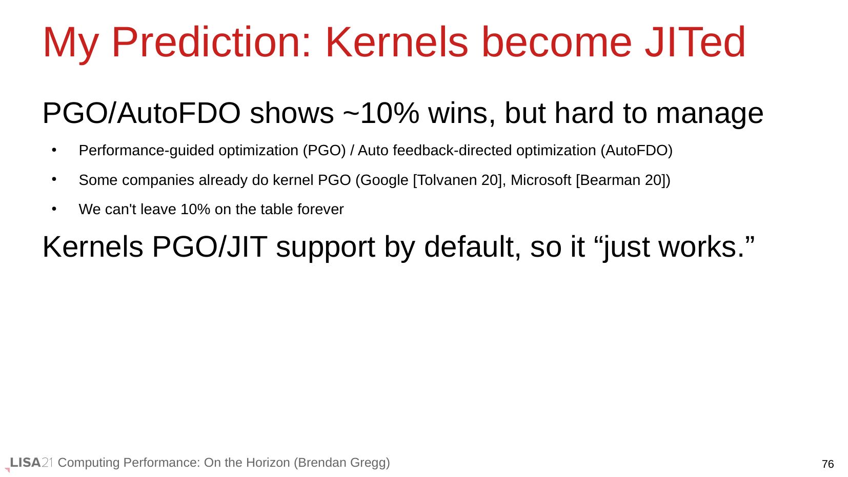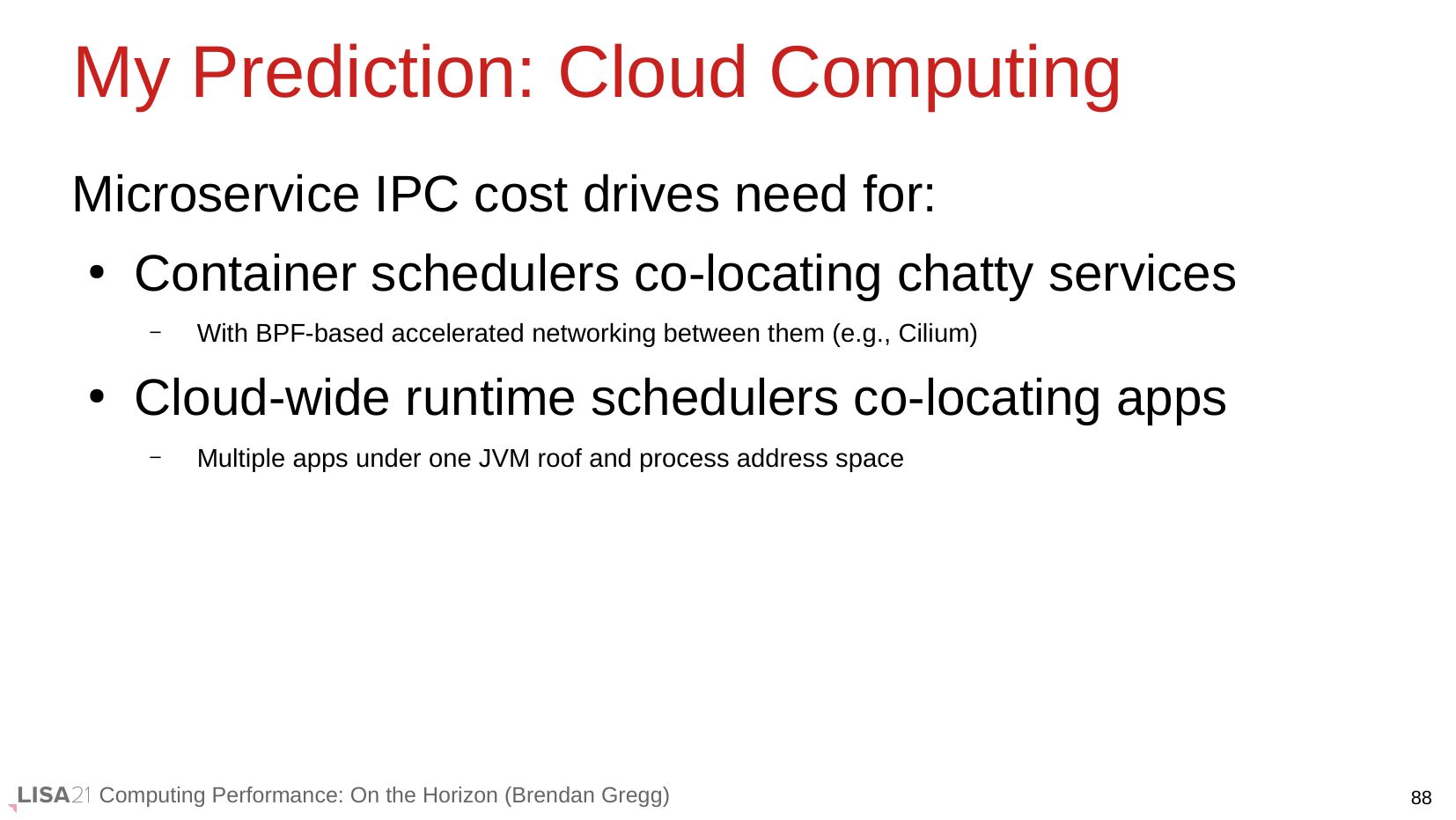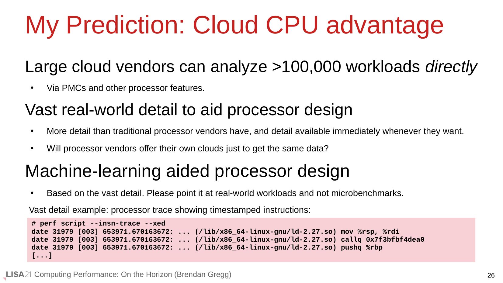 My Prediction: Cloud CPU advantage Large cloud vendors can analyze >gt;100,000 workloads directly Via PMCs and other processor features. Vast real-world detail to aid processor design More detail than traditional processor vendors have, and detail available immediately whenever they want. Will processor vendors offer their own clouds just to get the same data? Machine-learning aided processor design Based on the vast detail. Please point it at real-world workloads and not microbenchmarks. Vast detail example: processor trace showing timestamped instructions: # perf script --insn-trace --xed date 31979 [003] 653971.670163672: ... (/lib/x86_64-linux-gnu/ld-2.27.so) mov %rsp, %rdi date 31979 [003] 653971.670163672: ... (/lib/x86_64-linux-gnu/ld-2.27.so) callq 0x7f3bfbf4dea0 date 31979 [003] 653971.670163672: ... (/lib/x86_64-linux-gnu/ld-2.27.so) pushq %rbp [...] Computing Performance: On the Horizon (Brendan Gregg)slide 27:
