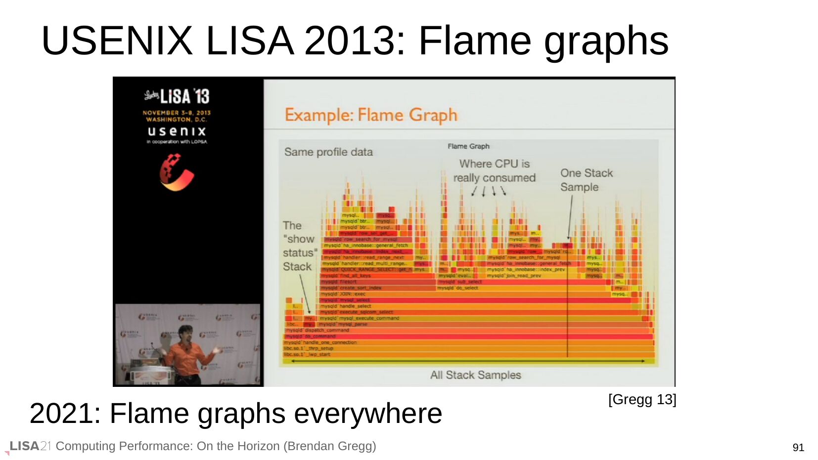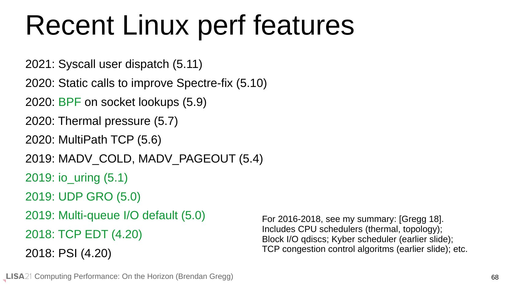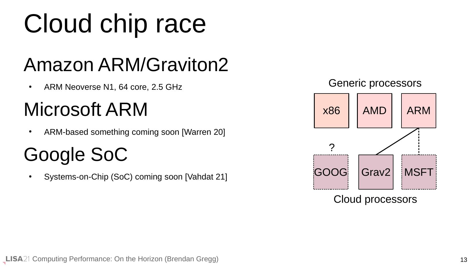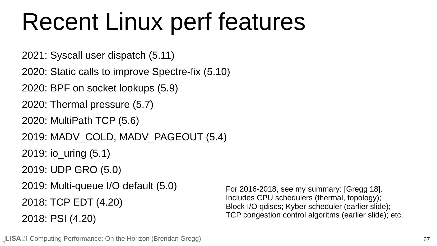 My Prediction: Cloud CPU advantage Large cloud vendors can analyze >gt;100,000 workloads directly Via PMCs and other processor features. Vast real-world detail to aid processor design More detail than traditional processor vendors have, and detail available immediately whenever they want. Will processor vendors offer their own clouds just to get the same data? Machine-learning aided processor design Based on the vast detail. Please point it at real-world workloads and not microbenchmarks. Vast detail example: processor trace showing timestamped instructions: # perf script --insn-trace --xed date 31979 [003] 653971.670163672: ... (/lib/x86_64-linux-gnu/ld-2.27.so) mov %rsp, %rdi date 31979 [003] 653971.670163672: ... (/lib/x86_64-linux-gnu/ld-2.27.so) callq 0x7f3bfbf4dea0 date 31979 [003] 653971.670163672: ... (/lib/x86_64-linux-gnu/ld-2.27.so) pushq %rbp [...] Computing Performance: On the Horizon (Brendan Gregg)slide 27: