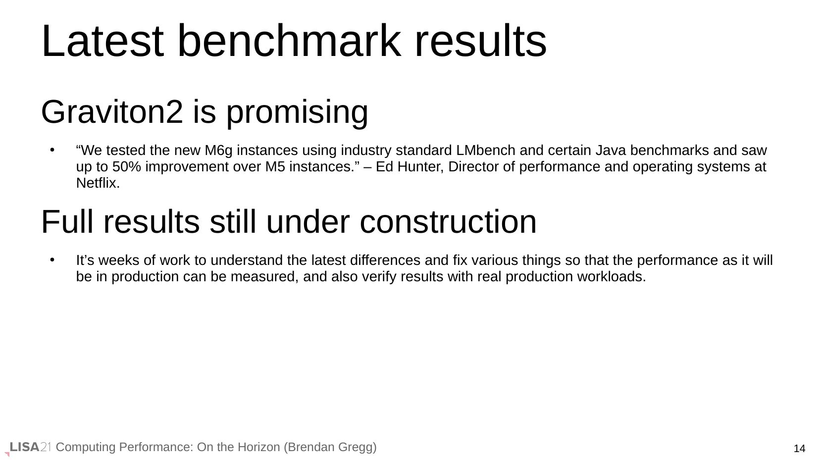 Latest benchmark results Graviton2 is promising “We tested the new M6g instances using industry standard LMbench and certain Java benchmarks and saw up to 50% improvement over M5 instances.” – Ed Hunter, Director of performance and operating systems at Netflix. Full results still under construction It’s weeks of work to understand the latest differences and fix various things so that the performance as it will be in production can be measured, and also verify results with real production workloads. Computing Performance: On the Horizon (Brendan Gregg)slide 15: