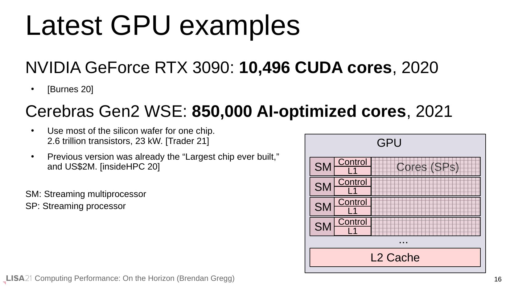 Latest GPU examples NVIDIA GeForce RTX 3090: 10,496 CUDA cores, 2020 [Burnes 20] Cerebras Gen2 WSE: 850,000 AI-optimized cores, 2021 Use most of the silicon wafer for one chip. 2.6 trillion transistors, 23 kW. [Trader 21] Previous version was already the “Largest chip ever built,” and US$2M. [insideHPC 20] SM: Streaming multiprocessor SP: Streaming processor GPU Control Control Control Control Cores (SPs) L2 Cache Computing Performance: On the Horizon (Brendan Gregg)slide 17: