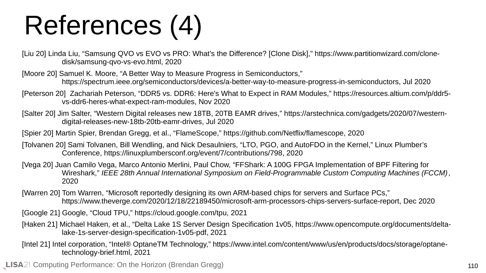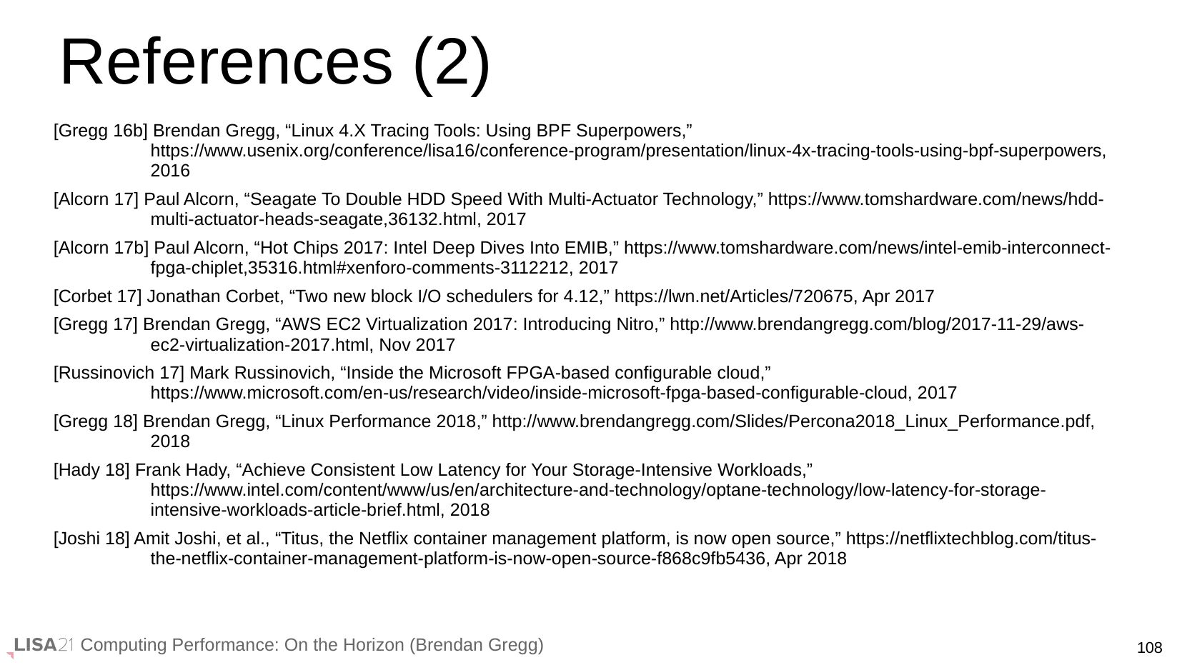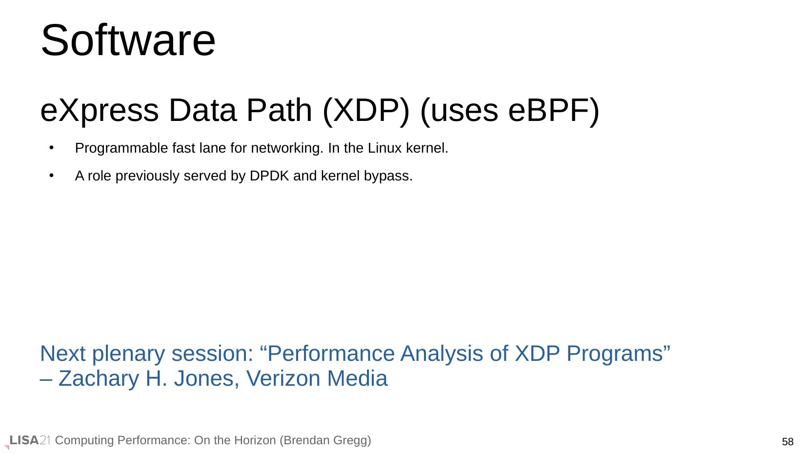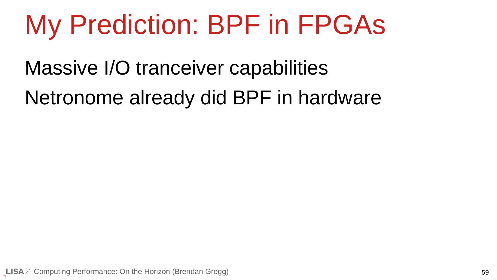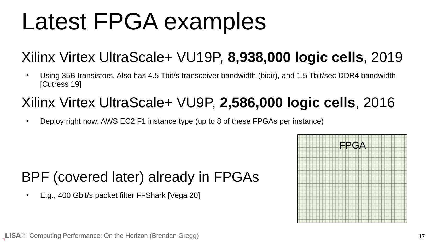 Latest FPGA examples Xilinx Virtex UltraScale+ VU19P, 8,938,000 logic cells, 2019 Using 35B transistors. Also has 4.5 Tbit/s transceiver bandwidth (bidir), and 1.5 Tbit/sec DDR4 bandwidth [Cutress 19] Xilinx Virtex UltraScale+ VU9P, 2,586,000 logic cells, 2016 Deploy right now: AWS EC2 F1 instance type (up to 8 of these FPGAs per instance) FPGA BPF (covered later) already in FPGAs E.g., 400 Gbit/s packet filter FFShark [Vega 20] Computing Performance: On the Horizon (Brendan Gregg)slide 18: