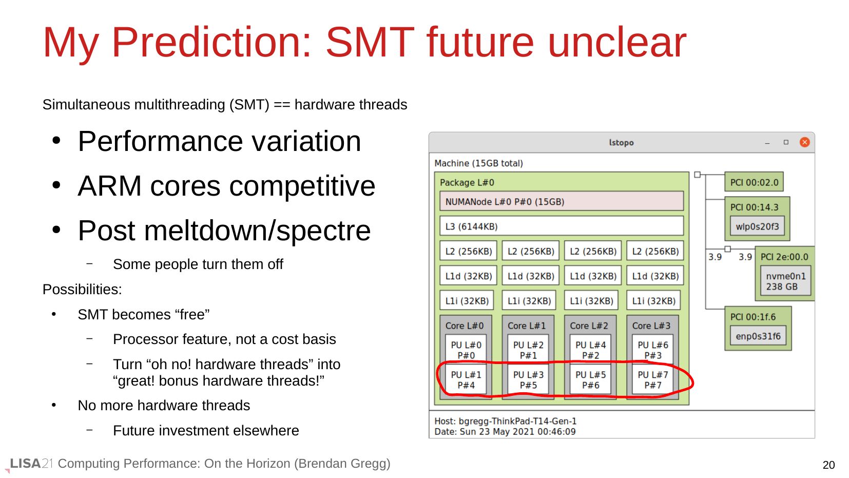 My Prediction: SMT future unclear Simultaneous multithreading (SMT) == hardware threads Performance variation ARM cores competitive Post meltdown/spectre Some people turn them off Possibilities: SMT becomes “free” Processor feature, not a cost basis Turn “oh no! hardware threads” into “great! bonus hardware threads!” No more hardware threads Future investment elsewhere Computing Performance: On the Horizon (Brendan Gregg)slide 21:
