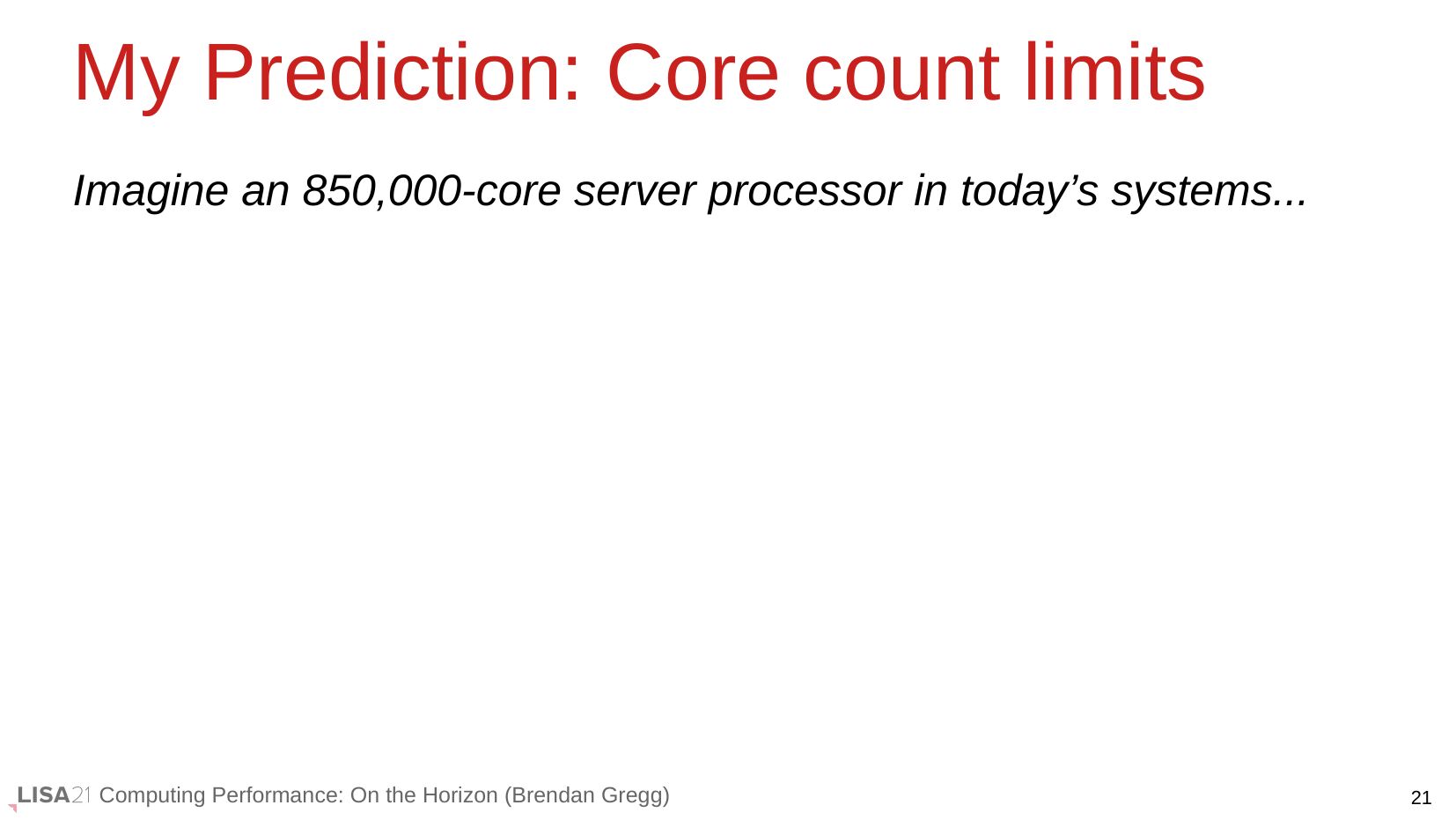 My Prediction: Core count limits Imagine an 850,000-core server processor in today’s systems... Computing Performance: On the Horizon (Brendan Gregg)slide 22: