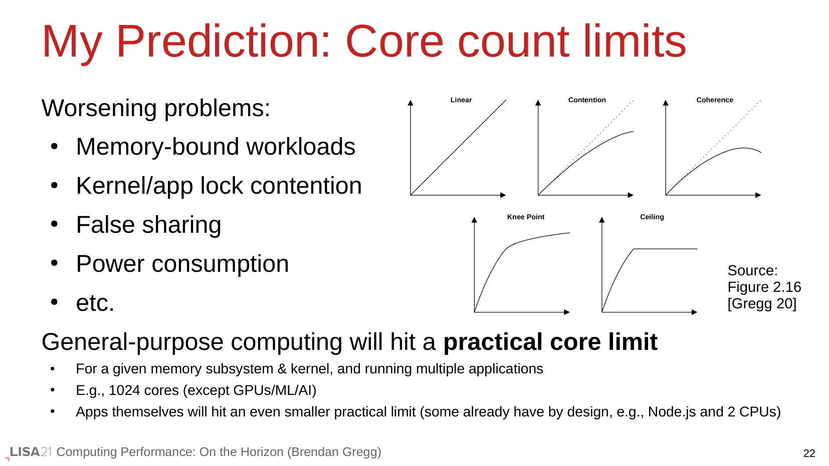 My Prediction: Core count limits Worsening problems: Memory-bound workloads Kernel/app lock contention False sharing Power consumption etc. Source: Figure 2.16 [Gregg 20] General-purpose computing will hit a practical core limit For a given memory subsystem & kernel, and running multiple applications E.g., 1024 cores (except GPUs/ML/AI) Apps themselves will hit an even smaller practical limit (some already have by design, e.g., Node.js and 2 CPUs) Computing Performance: On the Horizon (Brendan Gregg)slide 23: