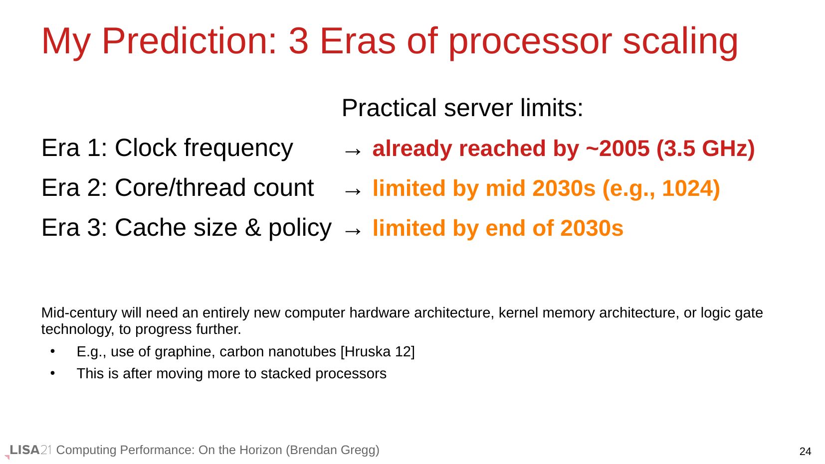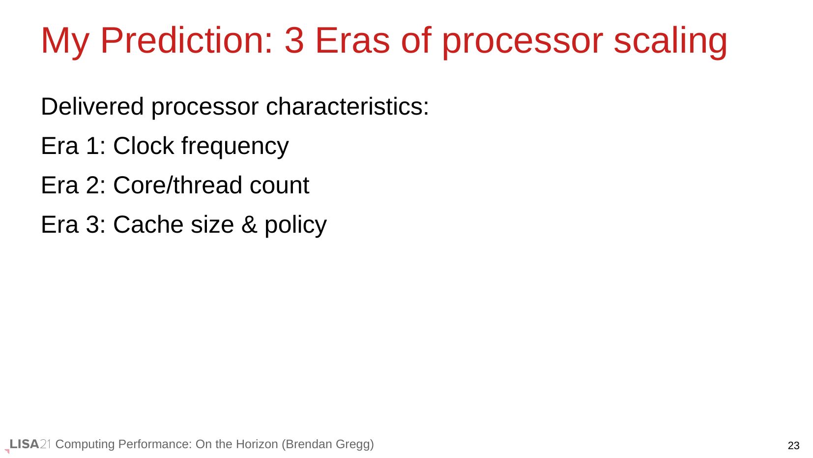 My Prediction: 3 Eras of processor scaling Delivered processor characteristics: Era 1: Clock frequency Era 2: Core/thread count Era 3: Cache size & policy Computing Performance: On the Horizon (Brendan Gregg)slide 24: