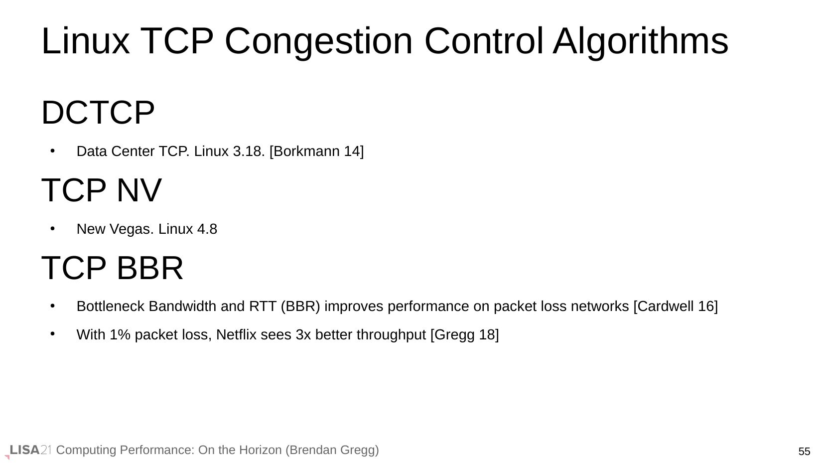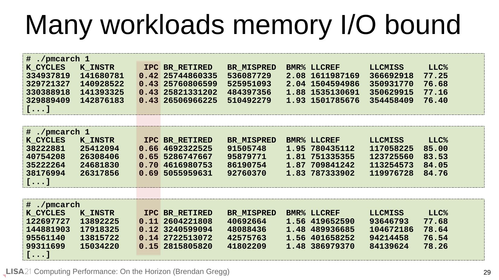 Many workloads memory I/O bound # ./pmcarch 1 K_CYCLES K_INSTR 334937819 141680781 329721327 140928522 330388918 141393325 329889409 142876183 [...] IPC BR_RETIRED 0.42 25744860335 0.43 25760806599 0.43 25821331202 0.43 26506966225 BR_MISPRED BMR% LLCREF 2.08 1611987169 2.04 1504594986 1.88 1535130691 1.93 1501785676 LLCMISS LLC% # ./pmcarch 1 K_CYCLES K_INSTR [...] IPC BR_RETIRED 0.66 4692322525 0.65 5286747667 0.70 4616980753 0.69 5055959631 BR_MISPRED BMR% LLCREF 1.95 780435112 1.81 751335355 1.87 709841242 1.83 787333902 LLCMISS LLC% # ./pmcarch K_CYCLES K_INSTR 122697727 13892225 144881903 17918325 [...] IPC BR_RETIRED 0.11 2604221808 0.12 3240599094 0.14 2722513072 0.15 2815805820 BR_MISPRED BMR% LLCREF 1.56 419652590 1.48 489936685 1.56 401658252 1.48 386979370 LLCMISS LLC% Computing Performance: On the Horizon (Brendan Gregg)slide 30: