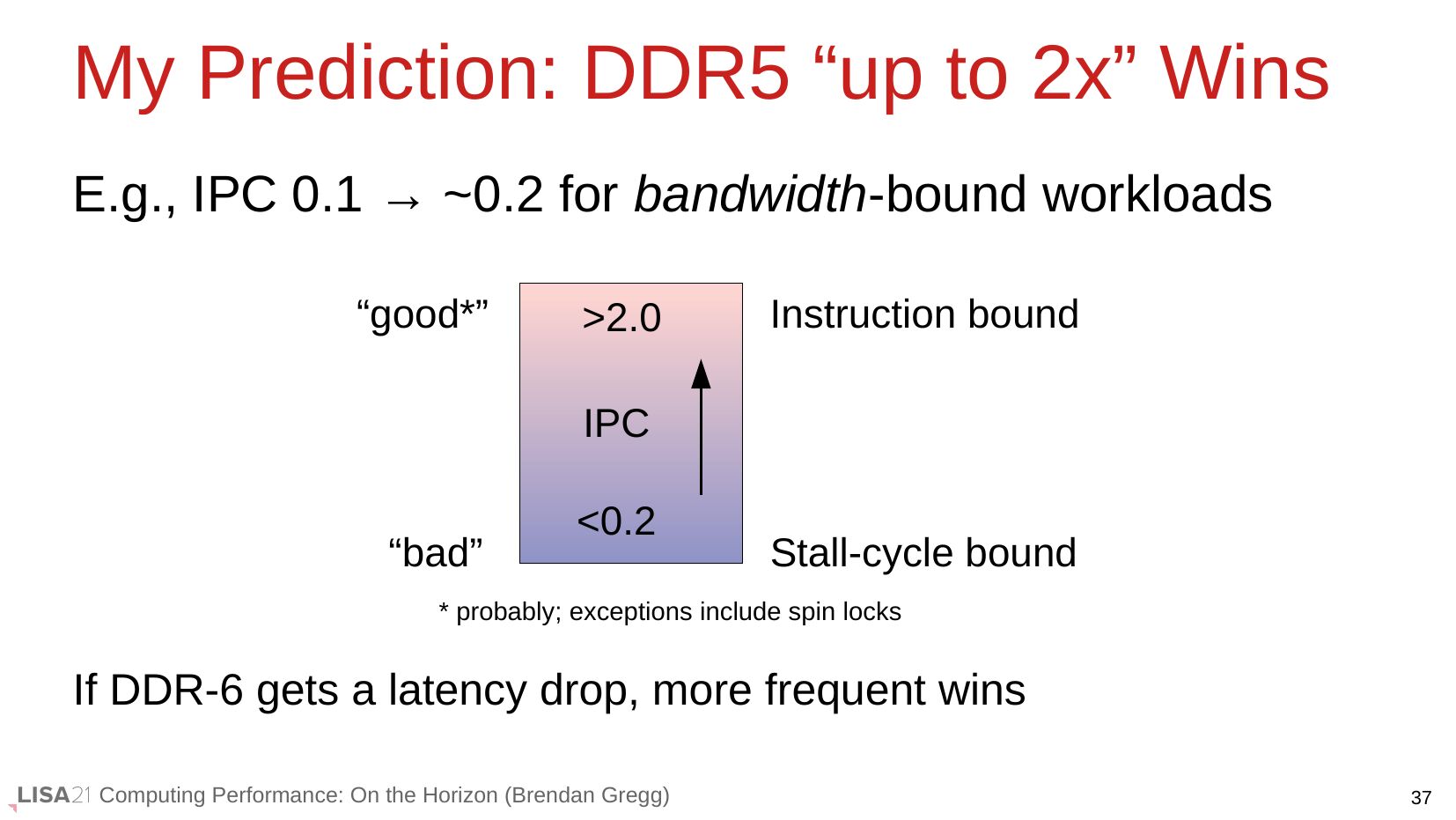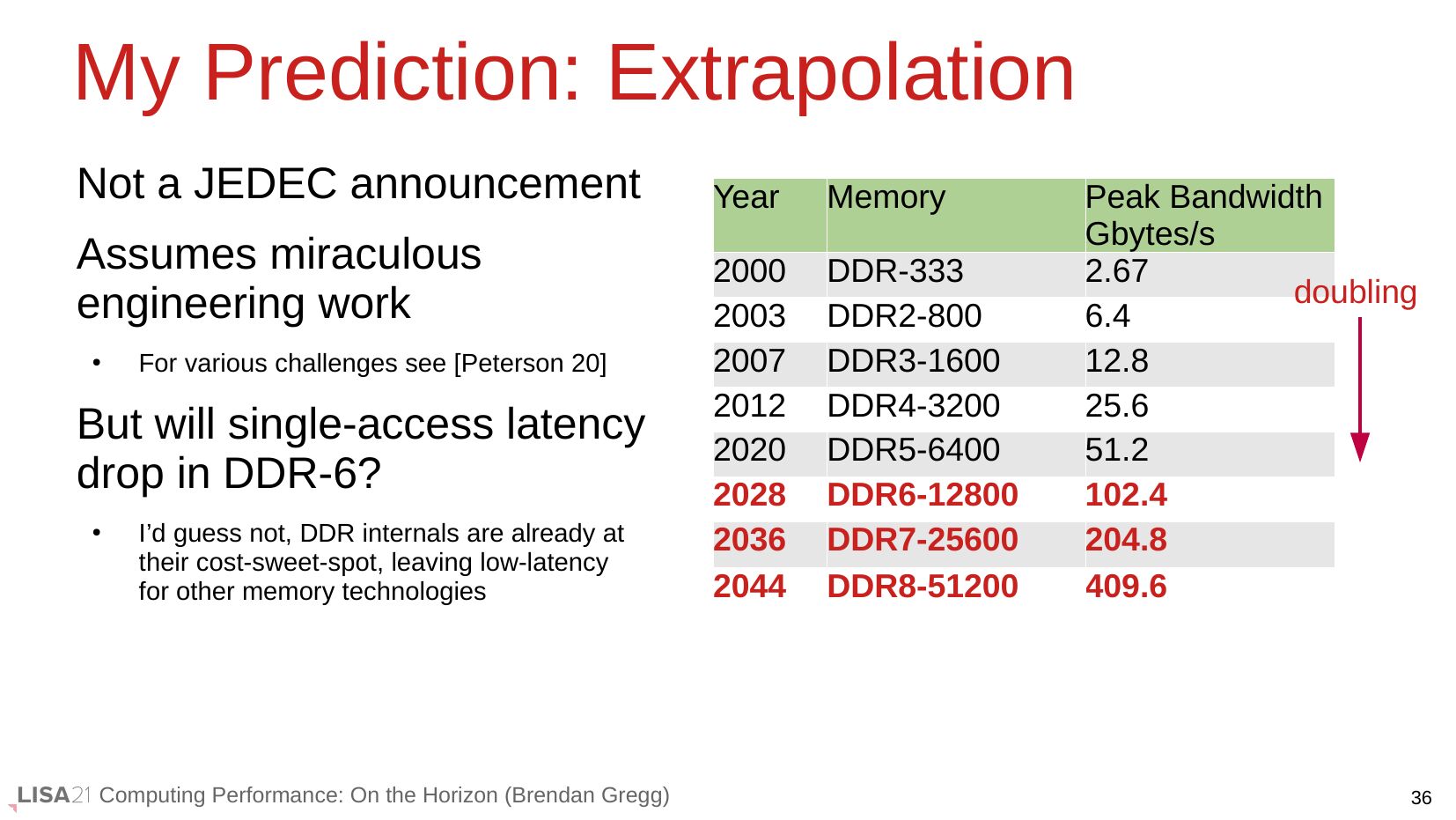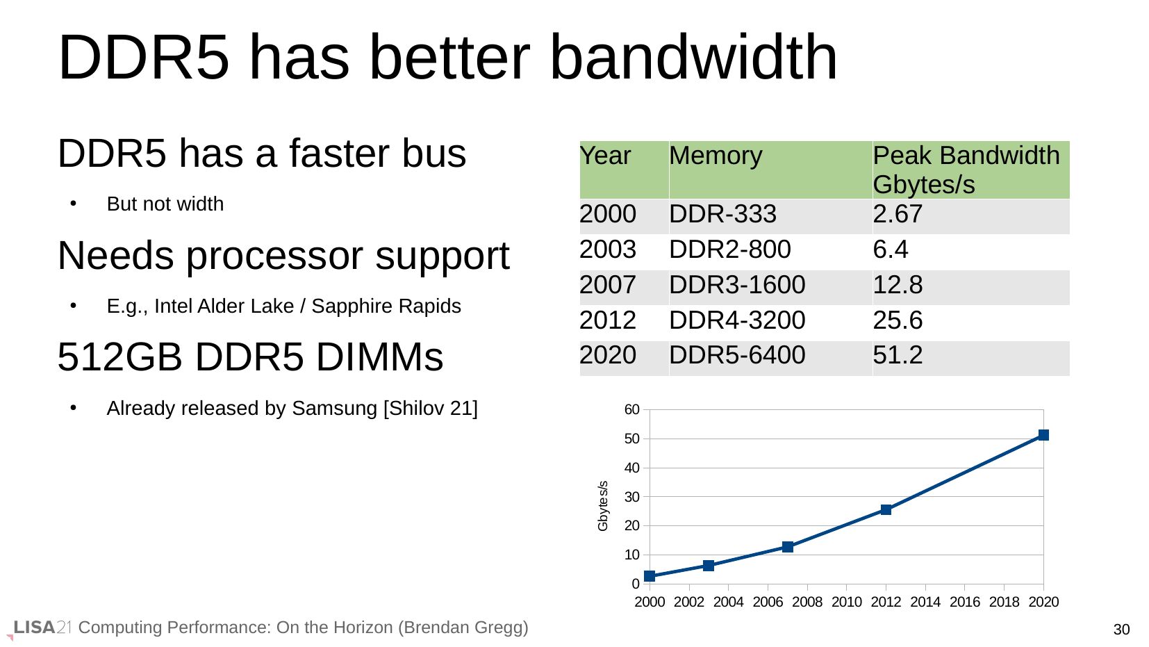DDR5 has better bandwidth DDR5 has a faster bus But not width Needs processor support E.g., Intel Alder Lake / Sapphire Rapids 512GB DDR5 DIMMs Memory DDR-333 DDR2-800 DDR3-1600 DDR4-3200 DDR5-6400 Already released by Samsung [Shilov 21] Peak Bandwidth Gbytes/s Gbytes/s Year 2000 2002 2004 2006 2008 2010 2012 2014 2016 2018 2020 Computing Performance: On the Horizon (Brendan Gregg)slide 31: