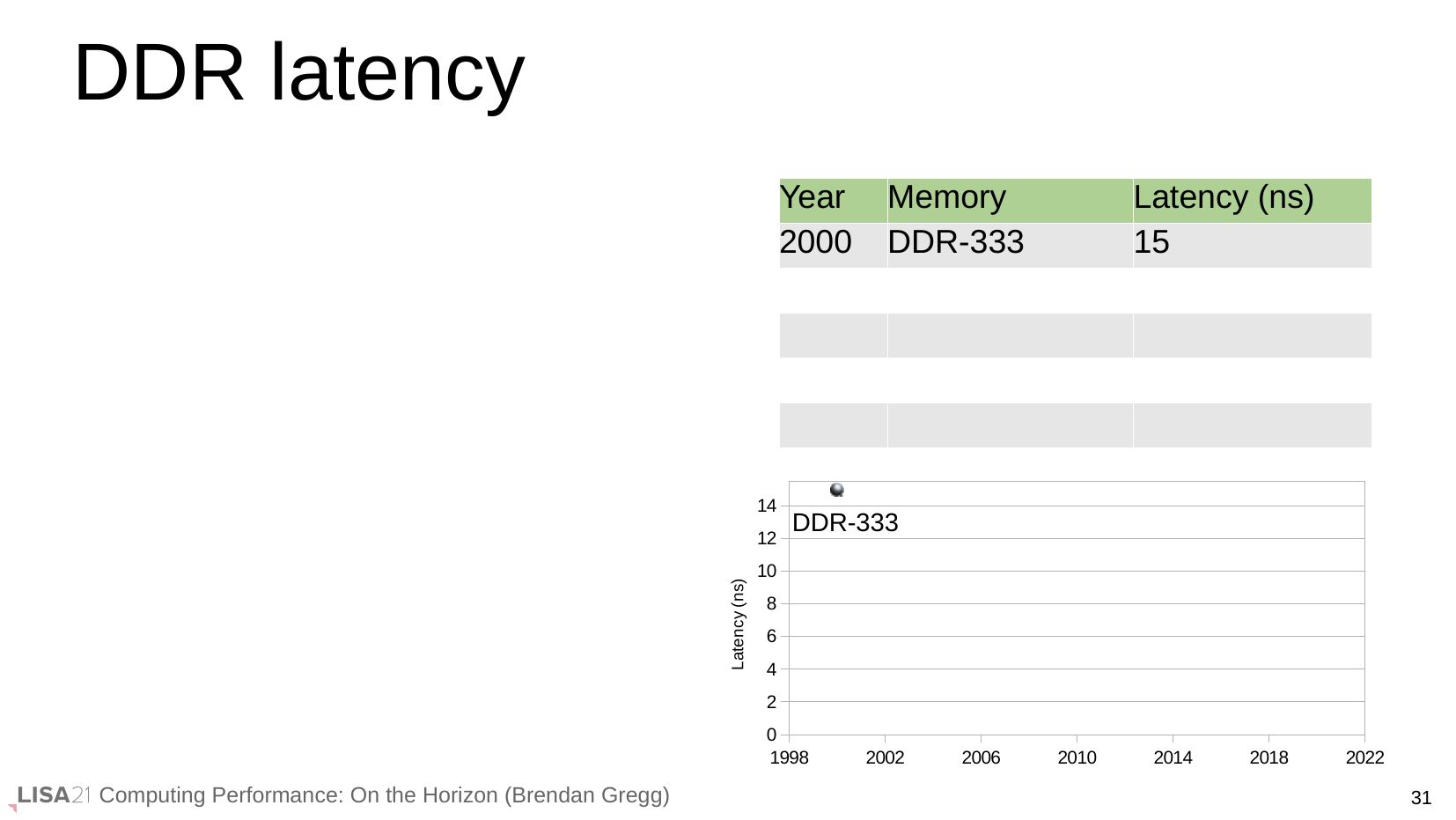 DDR latency Year Latency (ns) Memory DDR-333 Latency (ns) DDR-333 Computing Performance: On the Horizon (Brendan Gregg)slide 32: