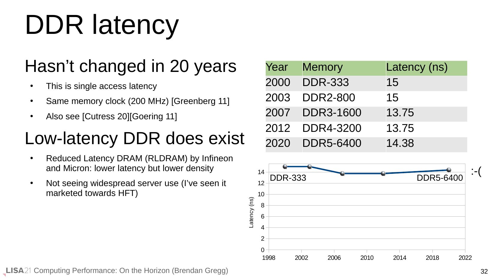 DDR latency Hasn’t changed in 20 years This is single access latency Same memory clock (200 MHz) [Greenberg 11] Also see [Cutress 20][Goering 11] Year Low-latency DDR does exist Reduced Latency DRAM (RLDRAM) by Infineon and Micron: lower latency but lower density Not seeing widespread server use (I’ve seen it marketed towards HFT) Latency (ns) Memory DDR-333 DDR2-800 DDR3-1600 DDR4-3200 DDR5-6400 Latency (ns) DDR-333 DDR5-6400 :-( Computing Performance: On the Horizon (Brendan Gregg)slide 33: