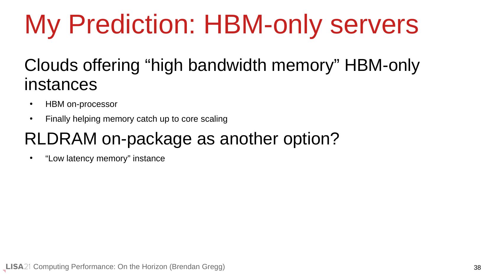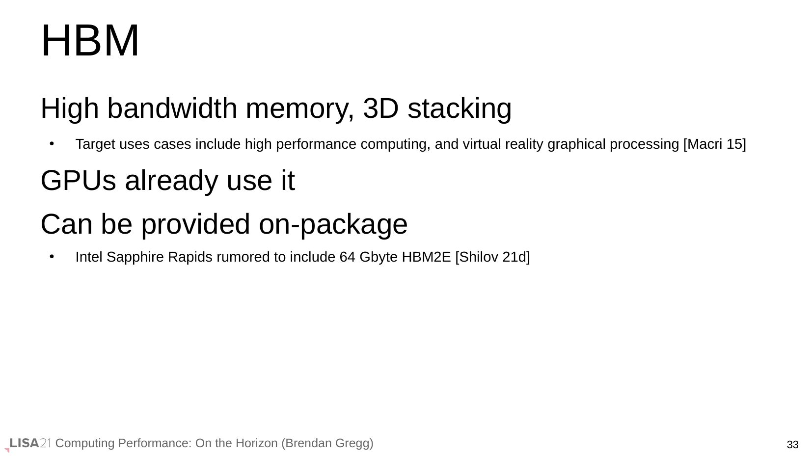HBM High bandwidth memory, 3D stacking Target uses cases include high performance computing, and virtual reality graphical processing [Macri 15] GPUs already use it Can be provided on-package Intel Sapphire Rapids rumored to include 64 Gbyte HBM2E [Shilov 21d] Computing Performance: On the Horizon (Brendan Gregg)slide 34: