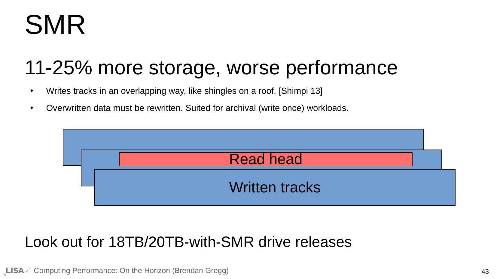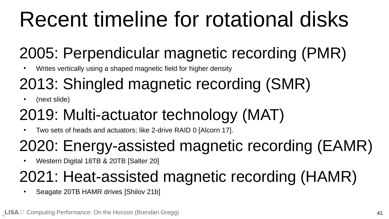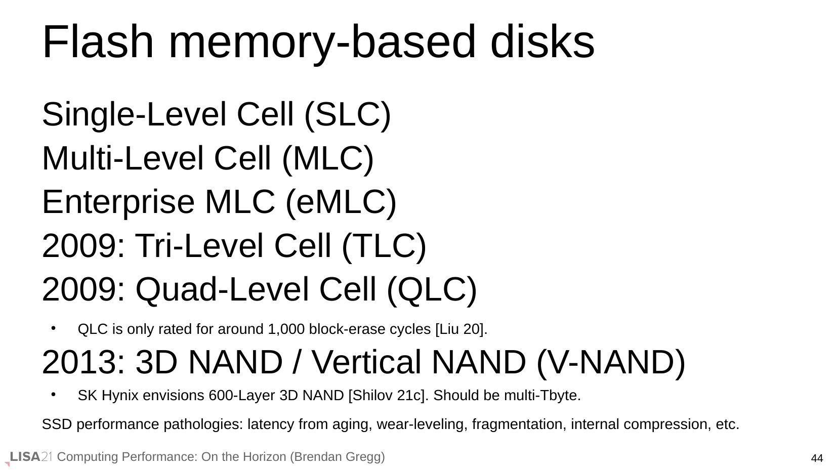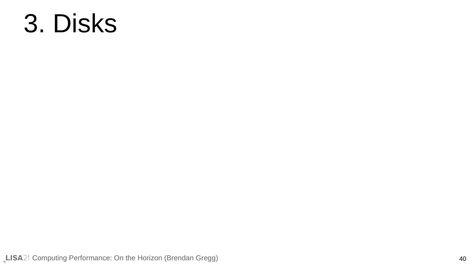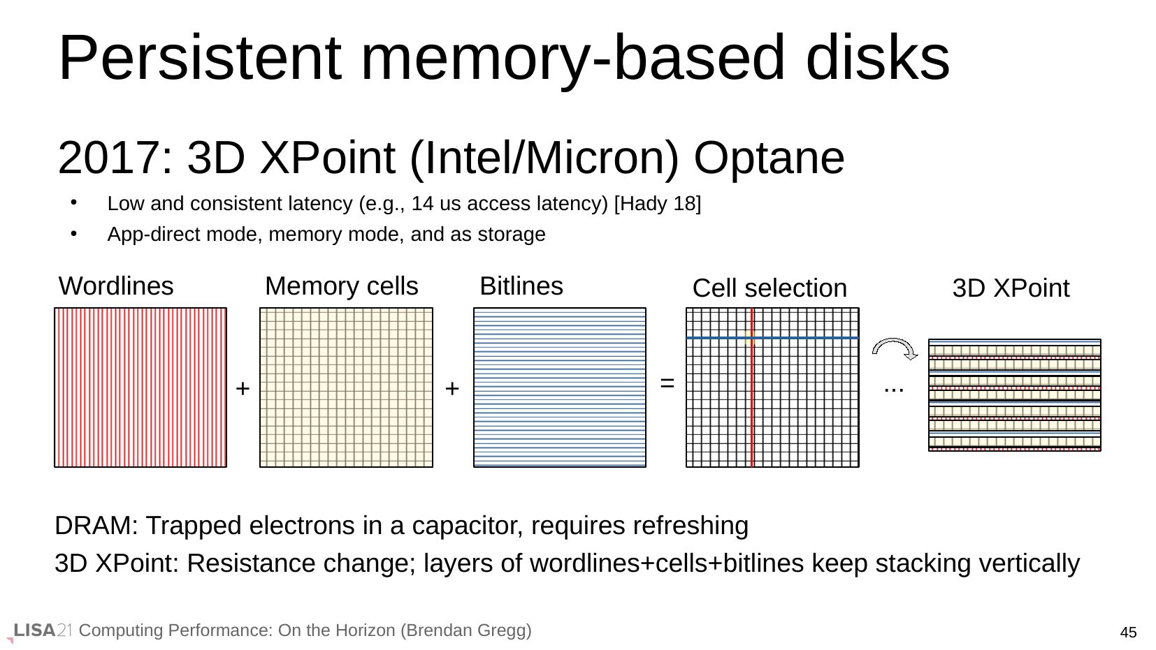 Additional memory tier 3D XPoint (next section) memory mode: - Can also operate in application direct mode and storage mode [Intel 21] Main memory Persistent memory Storage devices Computing Performance: On the Horizon (Brendan Gregg) DRAM (slide 36: My Prediction: Extrapolation Not a JEDEC announcement Assumes miraculous engineering work For various challenges see [Peterson 20] But will single-access latency drop in DDR-6? I’d guess not, DDR internals are already at their cost-sweet-spot, leaving low-latency for other memory technologies Computing Performance: On the Horizon (Brendan Gregg) Year Memory DDR-333 DDR2-800 DDR3-1600 DDR4-3200 DDR5-6400 DDR6-12800 DDR7-25600 DDR8-51200 Peak Bandwidth Gbytes/s doublingslide 37:My Prediction: DDR5 “up to 2x” Wins E.g., IPC 0.1 → ~0.2 for bandwidth-bound workloads “good*” >gt;2.0 Instruction bound IPC “bad”slide 38: My Prediction: HBM-only servers Clouds offering “high bandwidth memory” HBM-only instances HBM on-processor Finally helping memory catch up to core scaling RLDRAM on-package as another option? “Low latency memory” instance Computing Performance: On the Horizon (Brendan Gregg)slide 39:My Prediction: Extra tier too late Competition isn’t disks, it’s Tbytes of DRAM SuperMicro’s single socket should hit 8 Tbytes DDR-5 AWS EC2 p4.24xl has 1.1 Tbytes of DRAM (deploy now!) How often does your working set size (WSS) not fit? Across several of these for redundancy? Next tier needs to get much bigger than DRAM (10+x) and much cheaper to find an extra-tier use case (e.g., cost based). Meanwhile, DRAM is still getting bigger and faster I developed the first cache tier between main memory and disks to see widespread use: the ZFS L2ARC [Gregg 08] Main memory WSS Persistent memory Storage devices “cold” dataslide 40: 3. Disks Computing Performance: On the Horizon (Brendan Gregg)slide 41:Recent timeline for rotational disks 2005: Perpendicular magnetic recording (PMR) Writes vertically using a shaped magnetic field for higher density 2013: Shingled magnetic recording (SMR) (next slide) 2019: Multi-actuator technology (MAT) Two sets of heads and actuators; like 2-drive RAID 0 [Alcorn 17]. 2020: Energy-assisted magnetic recording (EAMR) Western Digital 18TB & 20TB [Salter 20] 2021: Heat-assisted magnetic recording (HAMR) Seagate 20TB HAMR drives [Shilov 21b] Computing Performance: On the Horizon (Brendan Gregg)slide 42:Recent timeline for rotational disks 2005: Perpendicular magnetic recording (PMR) Writes vertically using a shaped magnetic field for higher density 2013: Shingled magnetic recording (SMR) (next slide) 2019: Multi-actuator technology (MAT) Two sets of heads and actuators; like 2-drive RAID 0 [Alcorn 17]. 2020: Energy-assisted magnetic recording (EAMR) Western Digital 18TB & 20TB [Salter 20] 2021: Heat-assisted magnetic recording (HAMR) Seagate 20TB HAMR drives [Shilov 21b] Computing Performance: On the Horizon (Brendan Gregg) I don’t know their perf characteristics yet 42slide 43:SMR 11-25% more storage, worse performance Writes tracks in an overlapping way, like shingles on a roof. [Shimpi 13] Overwritten data must be rewritten. Suited for archival (write once) workloads. Read head Written tracks Look out for 18TB/20TB-with-SMR drive releases Computing Performance: On the Horizon (Brendan Gregg)slide 44:Flash memory-based disks Single-Level Cell (SLC) Multi-Level Cell (MLC) Enterprise MLC (eMLC) 2009: Tri-Level Cell (TLC) 2009: Quad-Level Cell (QLC) QLC is only rated for around 1,000 block-erase cycles [Liu 20]. 2013: 3D NAND / Vertical NAND (V-NAND) SK Hynix envisions 600-Layer 3D NAND [Shilov 21c]. Should be multi-Tbyte. SSD performance pathologies: latency from aging, wear-leveling, fragmentation, internal compression, etc. Computing Performance: On the Horizon (Brendan Gregg)slide 45:Persistent memory-based disks 2017: 3D XPoint (Intel/Micron) Optane Low and consistent latency (e.g., 14 us access latency) [Hady 18] App-direct mode, memory mode, and as storage Wordlines Memory cells Bitlines Cell selection 3D XPoint DRAM: Trapped electrons in a capacitor, requires refreshing 3D XPoint: Resistance change; layers of wordlines+cells+bitlines keep stacking vertically Computing Performance: On the Horizon (Brendan Gregg)slide 46:Latest storage device example 2021: Intel Optane memory H20 QLC 3D NAND storage (512 Gbytes / 1 Tbyte) + 3D XPoint as an accelerator (32 Gbytes) Currently M.2 2280 form factor (laptops) (Announced while I was developing these slides) Computing Performance: On the Horizon (Brendan Gregg)slide 47:Storage Interconnects SAS-4 cards in development (Storage attached SCSI) PCIe 5.0 coming soon (Peripheral Component Interconnect Express) Intel already demoed on Sapphire Rapids [Hruska 20] NVMe 1.4 latest (Non-Volatile Memory Express) Storage over PCIe bus Support zoned namespace SSDs (ZNS) [ZonedStorage 21] Bandwidth bounded by PCIe bus These have features other than speed Reliability, power management, virtualization support, etc. Computing Performance: On the Horizon (Brendan Gregg) Year Specified 202? Interface Year Specified Interface SAS-1 SAS-2 SAS-3 SAS-4 SAS-5 PCIe 1 PCIe 2 PCIe 3 PCIe 4 PCIe 5 Bandwidth Gbit/s Bandwidth 16 lane Gbyte/sslide 48:Linux Kyber I/O scheduler Multi-queue, target read & write latency Up to 300x lower 99th percentile latencies [Gregg 18] Linux 4.12 [Corbet 17] reads (sync) writes (async) Kyber (simplified) Computing Performance: On the Horizon (Brendan Gregg) dispatch dispatch queue size adjust completionsslide 49:My Prediction: Slower rotational Archive focus There’s ever-increasing demand for storage (incl. social video today; social VR tomorrow?) Needed for archives More “weird” pathologies. SMR is just the start. Even less tolerant to shouting Bigger, slower, and weirder Computing Performance: On the Horizon (Brendan Gregg)slide 50:My Prediction: 3D XPoint As a rotational disk accelerator As petabyte storage Layers keep stacking 3D NAND coul