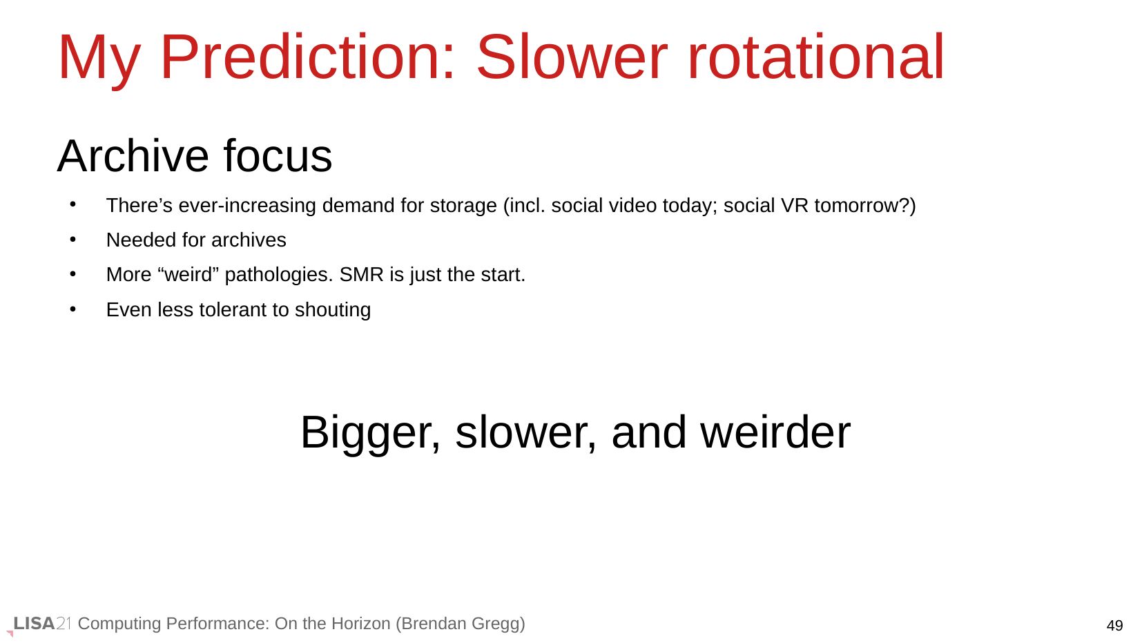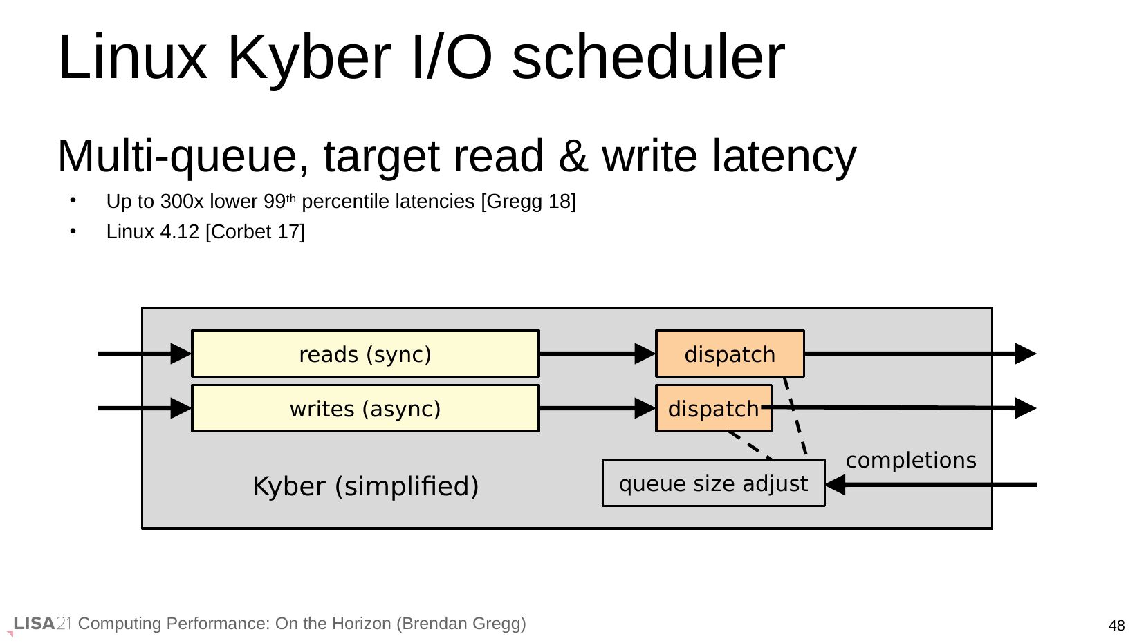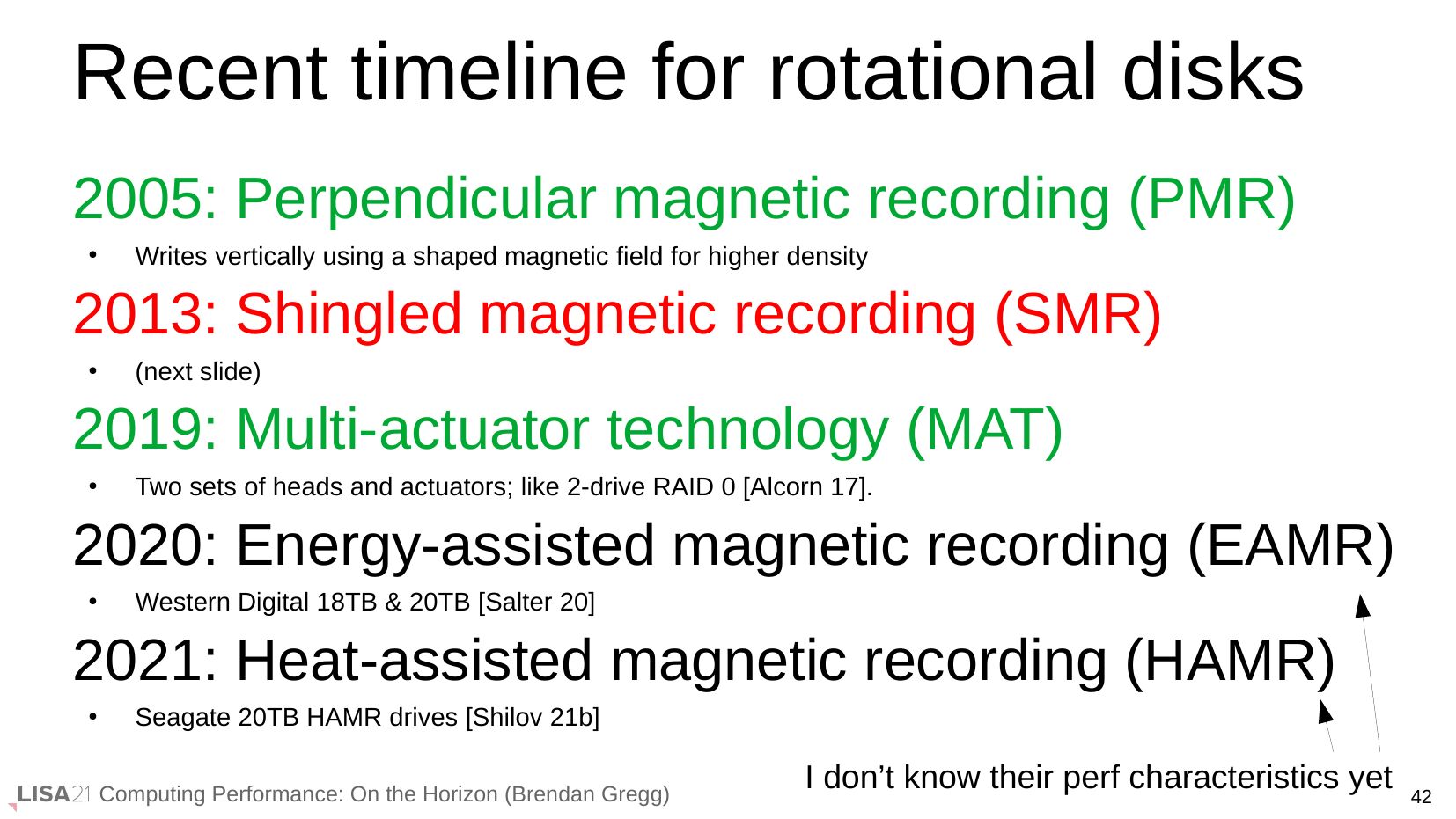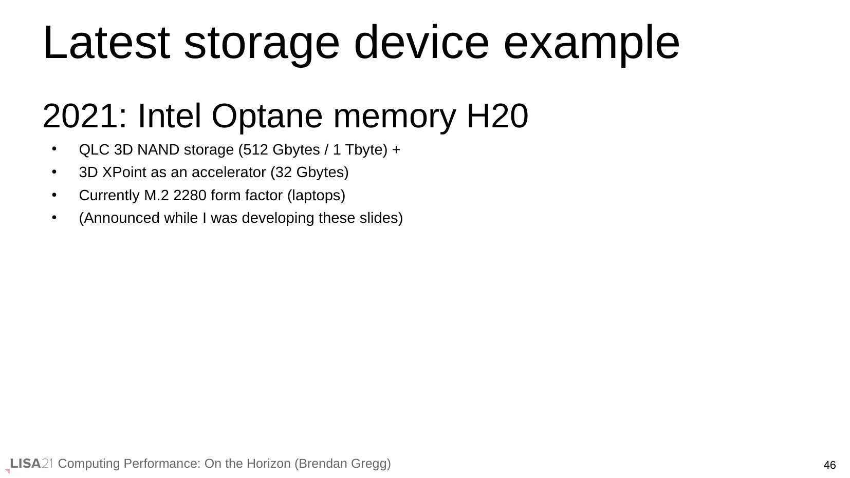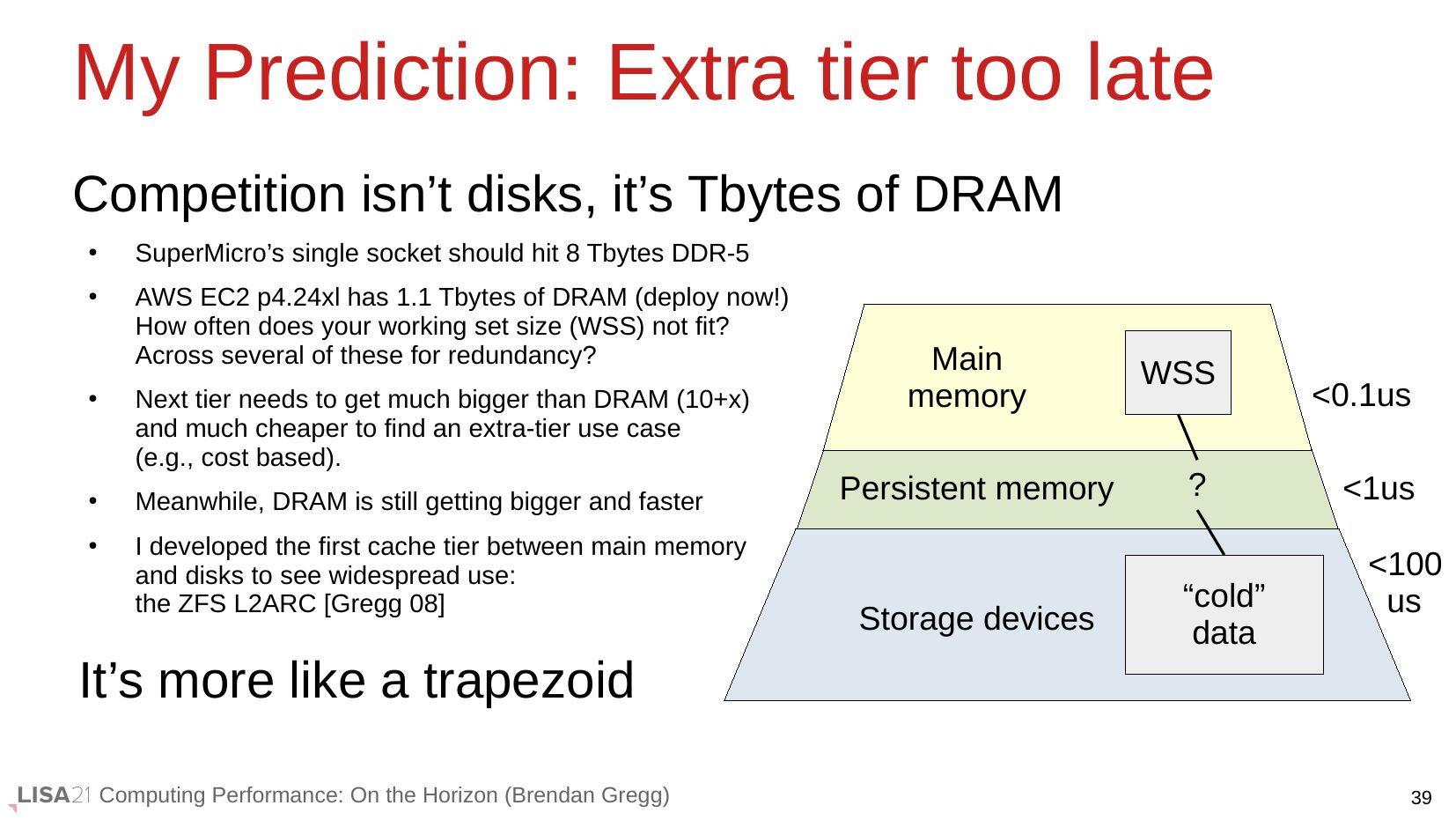 Additional memory tier 3D XPoint (next section) memory mode: - Can also operate in application direct mode and storage mode [Intel 21] Main memory Persistent memory Storage devices Computing Performance: On the Horizon (Brendan Gregg) DRAM (slide 36: My Prediction: Extrapolation Not a JEDEC announcement Assumes miraculous engineering work For various challenges see [Peterson 20] But will single-access latency drop in DDR-6? I’d guess not, DDR internals are already at their cost-sweet-spot, leaving low-latency for other memory technologies Computing Performance: On the Horizon (Brendan Gregg) Year Memory DDR-333 DDR2-800 DDR3-1600 DDR4-3200 DDR5-6400 DDR6-12800 DDR7-25600 DDR8-51200 Peak Bandwidth Gbytes/s doublingslide 37:My Prediction: DDR5 “up to 2x” Wins E.g., IPC 0.1 → ~0.2 for bandwidth-bound workloads “good*” >gt;2.0 Instruction bound IPC “bad”slide 38: My Prediction: HBM-only servers Clouds offering “high bandwidth memory” HBM-only instances HBM on-processor Finally helping memory catch up to core scaling RLDRAM on-package as another option? “Low latency memory” instance Computing Performance: On the Horizon (Brendan Gregg)slide 39:My Prediction: Extra tier too late Competition isn’t disks, it’s Tbytes of DRAM SuperMicro’s single socket should hit 8 Tbytes DDR-5 AWS EC2 p4.24xl has 1.1 Tbytes of DRAM (deploy now!) How often does your working set size (WSS) not fit? Across several of these for redundancy? Next tier needs to get much bigger than DRAM (10+x) and much cheaper to find an extra-tier use case (e.g., cost based). Meanwhile, DRAM is still getting bigger and faster I developed the first cache tier between main memory and disks to see widespread use: the ZFS L2ARC [Gregg 08] Main memory WSS Persistent memory Storage devices “cold” dataslide 40: 3. Disks Computing Performance: On the Horizon (Brendan Gregg)slide 41:Recent timeline for rotational disks 2005: Perpendicular magnetic recording (PMR) Writes vertically using a shaped magnetic field for higher density 2013: Shingled magnetic recording (SMR) (next slide) 2019: Multi-actuator technology (MAT) Two sets of heads and actuators; like 2-drive RAID 0 [Alcorn 17]. 2020: Energy-assisted magnetic recording (EAMR) Western Digital 18TB & 20TB [Salter 20] 2021: Heat-assisted magnetic recording (HAMR) Seagate 20TB HAMR drives [Shilov 21b] Computing Performance: On the Horizon (Brendan Gregg)slide 42:Recent timeline for rotational disks 2005: Perpendicular magnetic recording (PMR) Writes vertically using a shaped magnetic field for higher density 2013: Shingled magnetic recording (SMR) (next slide) 2019: Multi-actuator technology (MAT) Two sets of heads and actuators; like 2-drive RAID 0 [Alcorn 17]. 2020: Energy-assisted magnetic recording (EAMR) Western Digital 18TB & 20TB [Salter 20] 2021: Heat-assisted magnetic recording (HAMR) Seagate 20TB HAMR drives [Shilov 21b] Computing Performance: On the Horizon (Brendan Gregg) I don’t know their perf characteristics yet 42slide 43:SMR 11-25% more storage, worse performance Writes tracks in an overlapping way, like shingles on a roof. [Shimpi 13] Overwritten data must be rewritten. Suited for archival (write once) workloads. Read head Written tracks Look out for 18TB/20TB-with-SMR drive releases Computing Performance: On the Horizon (Brendan Gregg)slide 44:Flash memory-based disks Single-Level Cell (SLC) Multi-Level Cell (MLC) Enterprise MLC (eMLC) 2009: Tri-Level Cell (TLC) 2009: Quad-Level Cell (QLC) QLC is only rated for around 1,000 block-erase cycles [Liu 20]. 2013: 3D NAND / Vertical NAND (V-NAND) SK Hynix envisions 600-Layer 3D NAND [Shilov 21c]. Should be multi-Tbyte. SSD performance pathologies: latency from aging, wear-leveling, fragmentation, internal compression, etc. Computing Performance: On the Horizon (Brendan Gregg)slide 45:Persistent memory-based disks 2017: 3D XPoint (Intel/Micron) Optane Low and consistent latency (e.g., 14 us access latency) [Hady 18] App-direct mode, memory mode, and as storage Wordlines Memory cells Bitlines Cell selection 3D XPoint DRAM: Trapped electrons in a capacitor, requires refreshing 3D XPoint: Resistance change; layers of wordlines+cells+bitlines keep stacking vertically Computing Performance: On the Horizon (Brendan Gregg)slide 46:Latest storage device example 2021: Intel Optane memory H20 QLC 3D NAND storage (512 Gbytes / 1 Tbyte) + 3D XPoint as an accelerator (32 Gbytes) Currently M.2 2280 form factor (laptops) (Announced while I was developing these slides) Computing Performance: On the Horizon (Brendan Gregg)slide 47:Storage Interconnects SAS-4 cards in development (Storage attached SCSI) PCIe 5.0 coming soon (Peripheral Component Interconnect Express) Intel already demoed on Sapphire Rapids [Hruska 20] NVMe 1.4 latest (Non-Volatile Memory Express) Storage over PCIe bus Support zoned namespace SSDs (ZNS) [ZonedStorage 21] Bandwidth bounded by PCIe bus These have features other than speed Reliability, power management, virtualization support, etc. Computing Performance: On the Horizon (Brendan Gregg) Year Specified 202? Interface Year Specified Interface SAS-1 SAS-2 SAS-3 SAS-4 SAS-5 PCIe 1 PCIe 2 PCIe 3 PCIe 4 PCIe 5 Bandwidth Gbit/s Bandwidth 16 lane Gbyte/sslide 48:Linux Kyber I/O scheduler Multi-queue, target read & write latency Up to 300x lower 99th percentile latencies [Gregg 18] Linux 4.12 [Corbet 17] reads (sync) writes (async) Kyber (simplified) Computing Performance: On the Horizon (Brendan Gregg) dispatch dispatch queue size adjust completionsslide 49:My Prediction: Slower rotational Archive focus There’s ever-increasing demand for storage (incl. social video today; social VR tomorrow?) Needed for archives More “weird” pathologies. SMR is just the start. Even less tolerant to shouting Bigger, slower, and weirder Computing Performance: On the Horizon (Brendan Gregg)slide 50:My Prediction: 3D XPoint As a rotational disk accelerator As petabyte storage Layers keep stacking 3D NAND coul