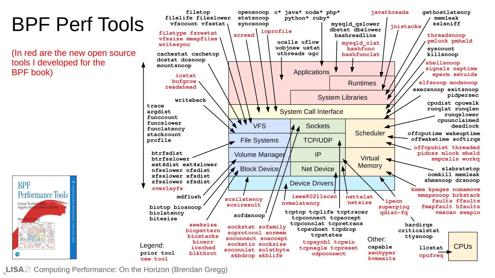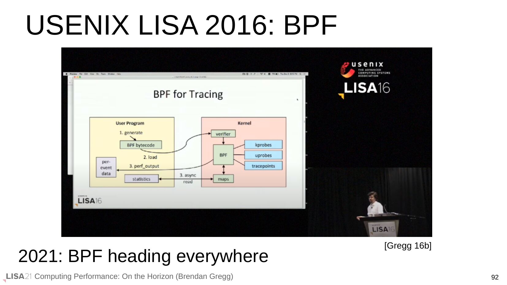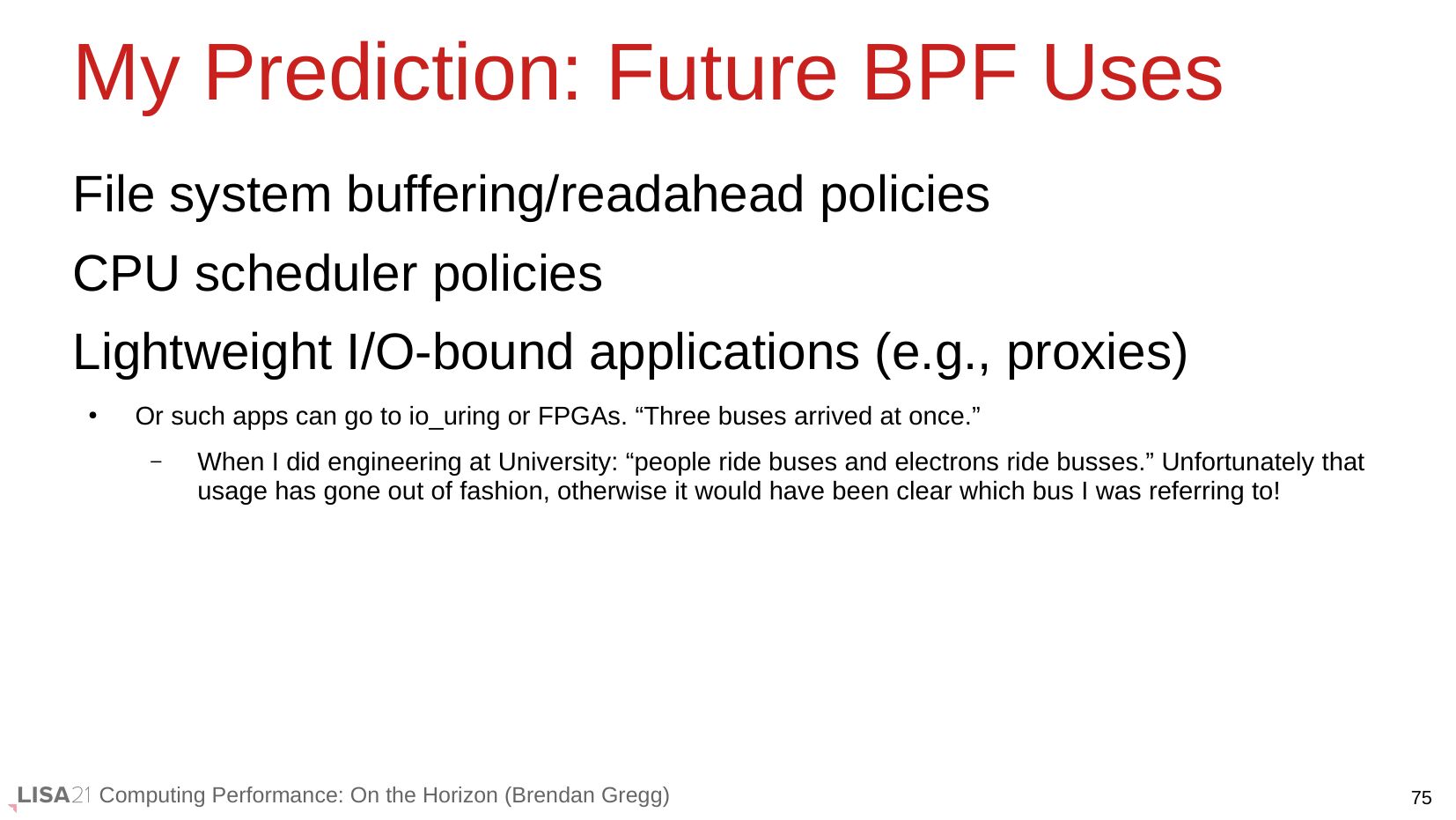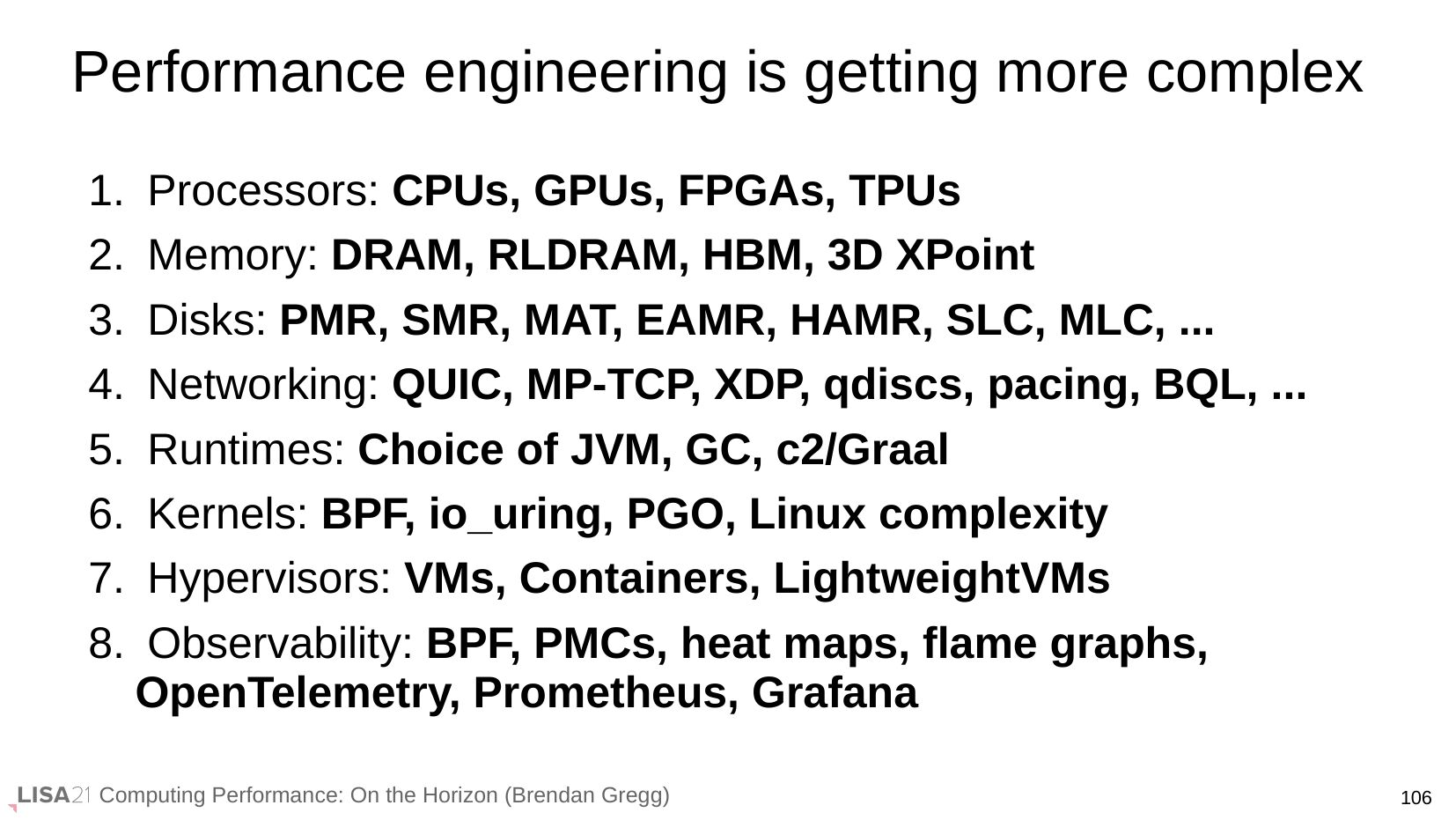 Description: "The future of computer performance involves clouds with hardware hypervisors and custom processors, servers running a new type of BPF software to allow high-speed applications and kernel customizations, observability of everything in production, new Linux kernel technologies, and more. This talk covers interesting developments in systems and computing performance, their challenges, and where things are headed."