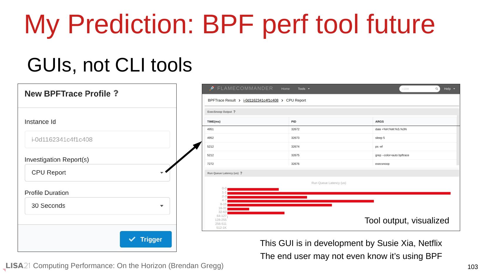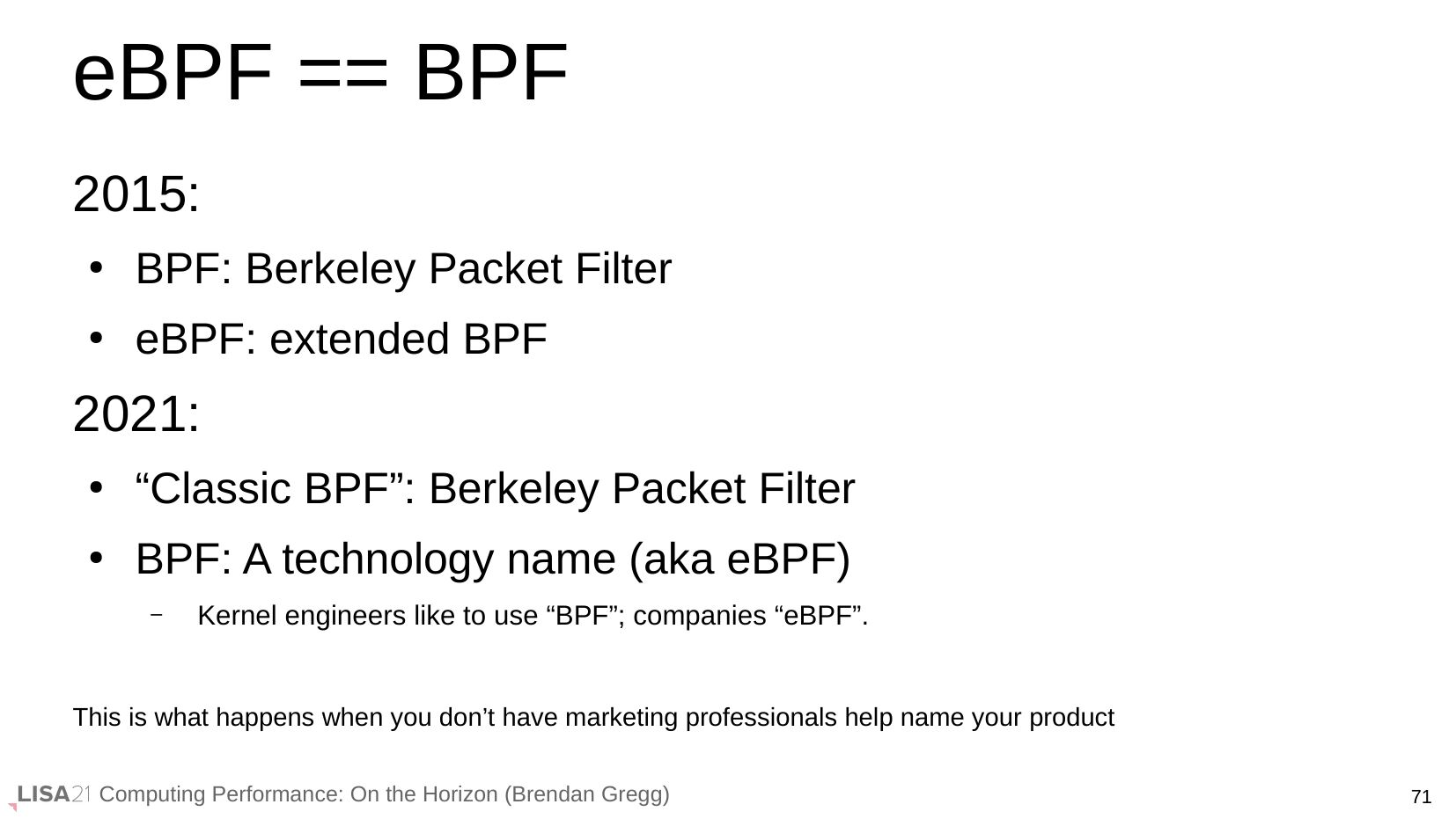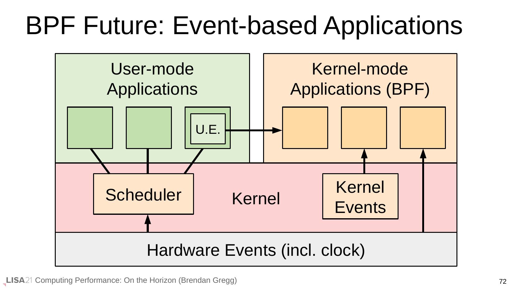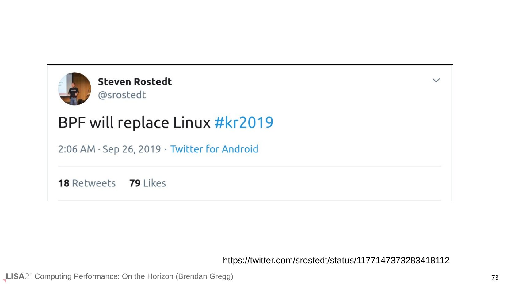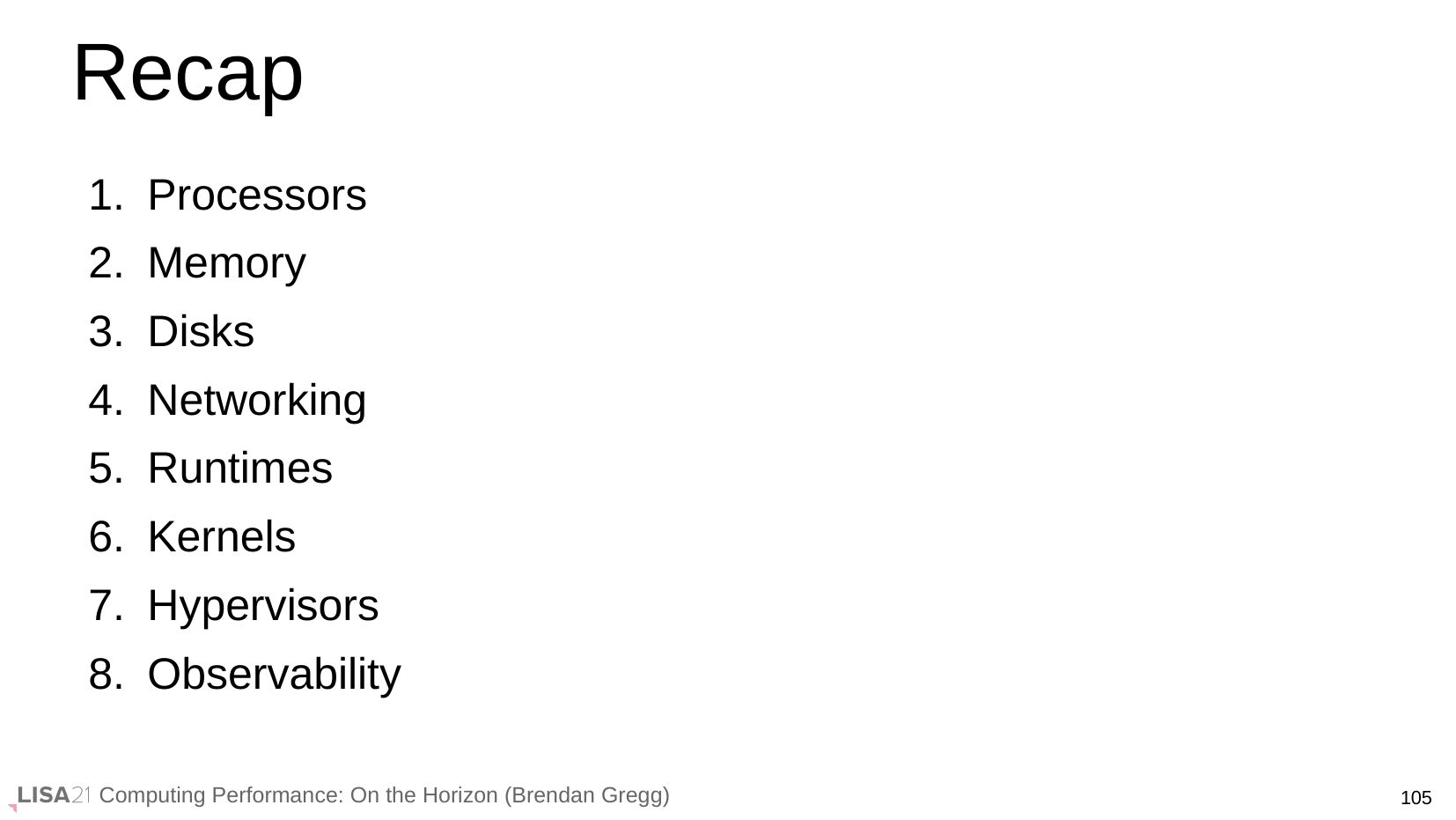 Description: "The future of computer performance involves clouds with hardware hypervisors and custom processors, servers running a new type of BPF software to allow high-speed applications and kernel customizations, observability of everything in production, new Linux kernel technologies, and more. This talk covers interesting developments in systems and computing performance, their challenges, and where things are headed."