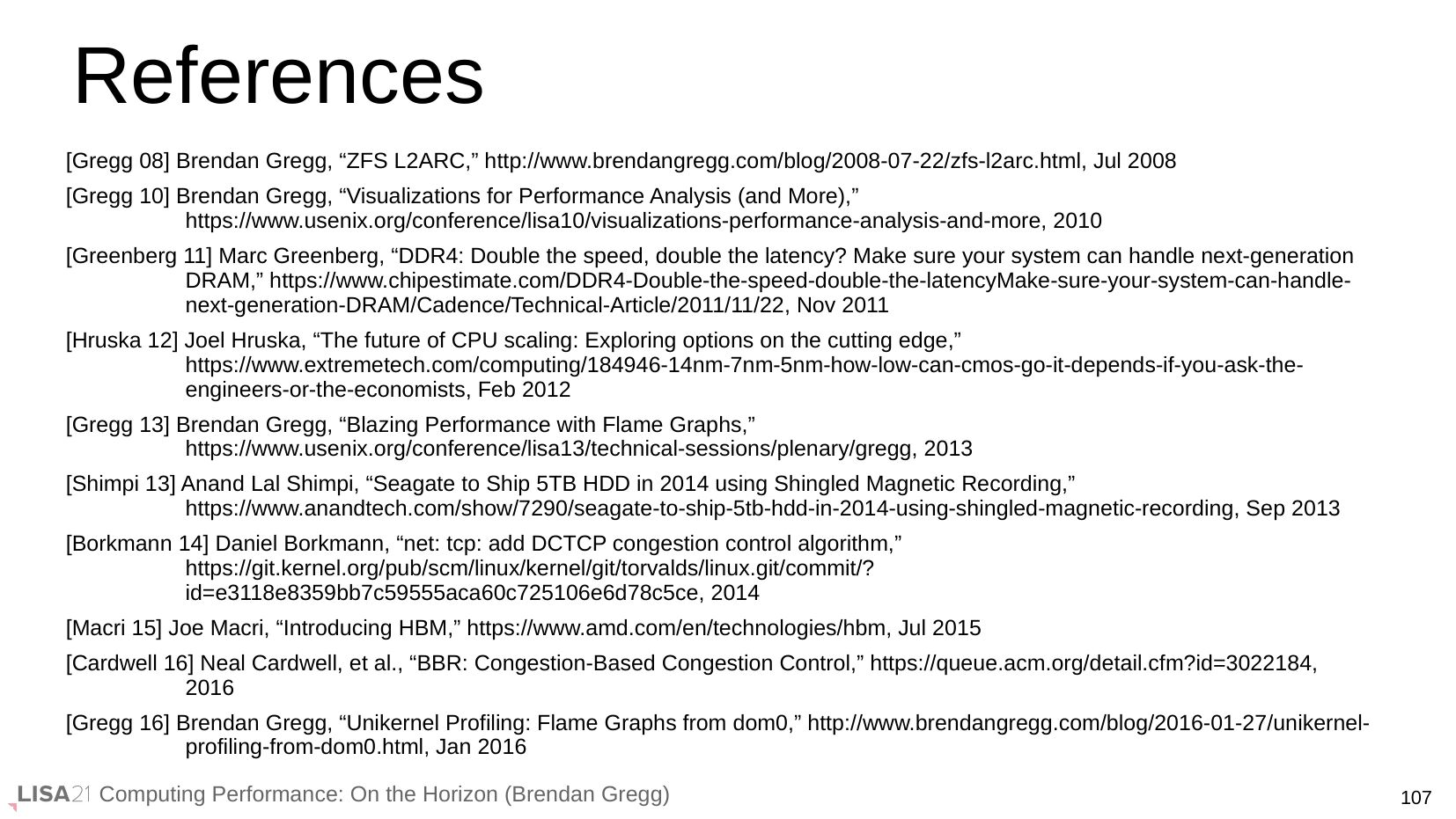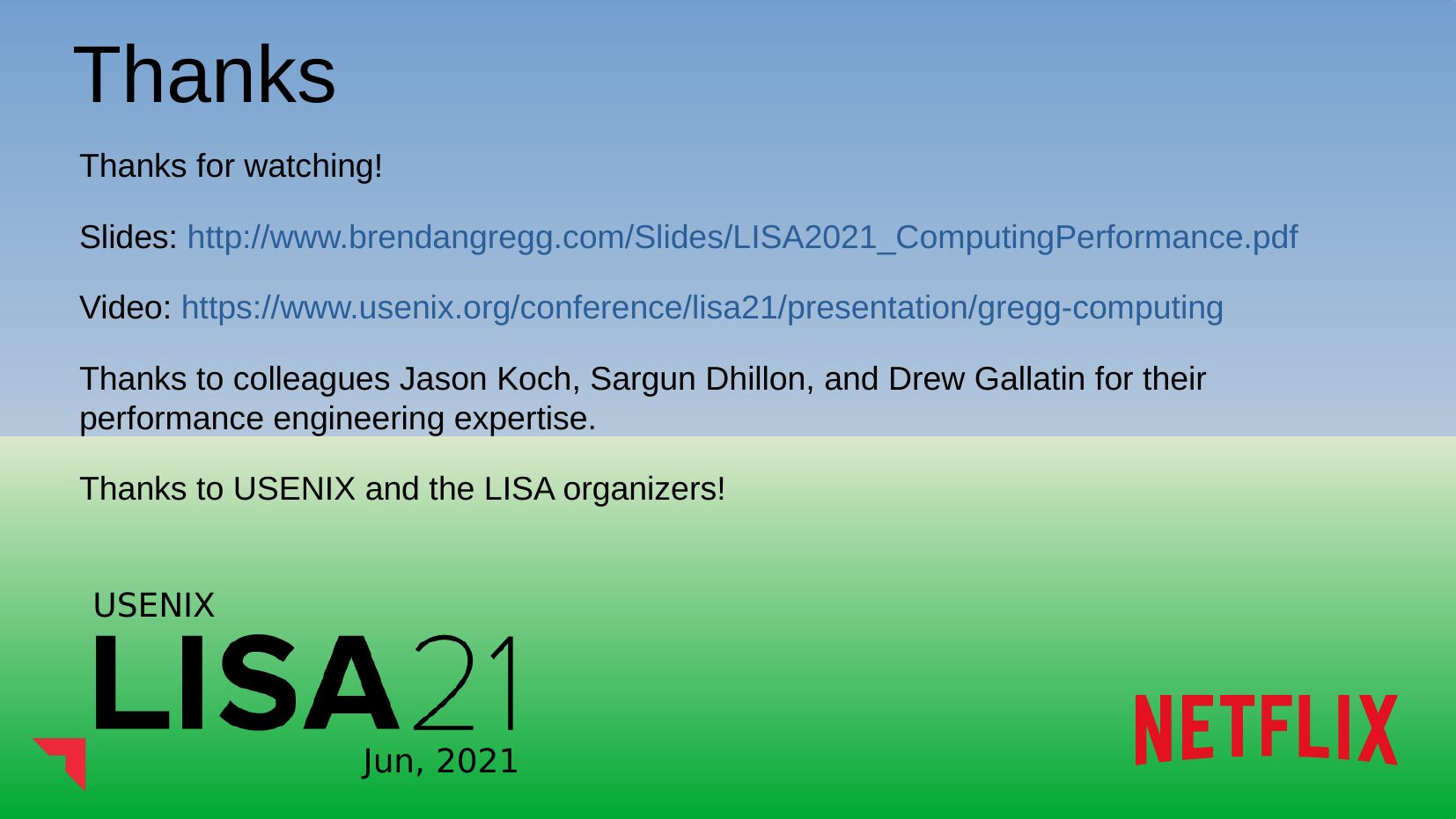 My Prediction: More processor vendors ARM licensed Era of CPU choice Beware: “optimizing for the benchmark” Don’t believe microbenchmarks without doing “active benchmarking”: Root-cause perf analysis while the benchmark is still running. Cores Benchmark Optimizer Unit (confidential) LLC MMU DogeCPU “+AggressiveOpts” processor Computing Performance: On the Horizon (Brendan Gregg)slide 26: