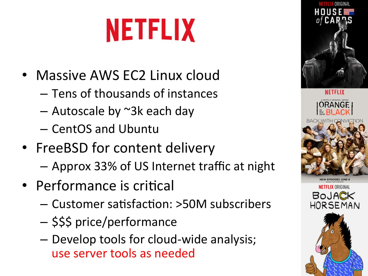 • Massive AWS EC2 Linux cloud – Tens of thousands of instances – Autoscale by ~3k each day – CentOS and Ubuntu • FreeBSD for content delivery – Approx 33% of US Internet traffic at night • Performance is criVcal – Customer saVsfacVon: >gt;50M subscribers – $$$ price/performance – Develop tools for cloud-‐wide analysis; use server tools as neededslide 4:
