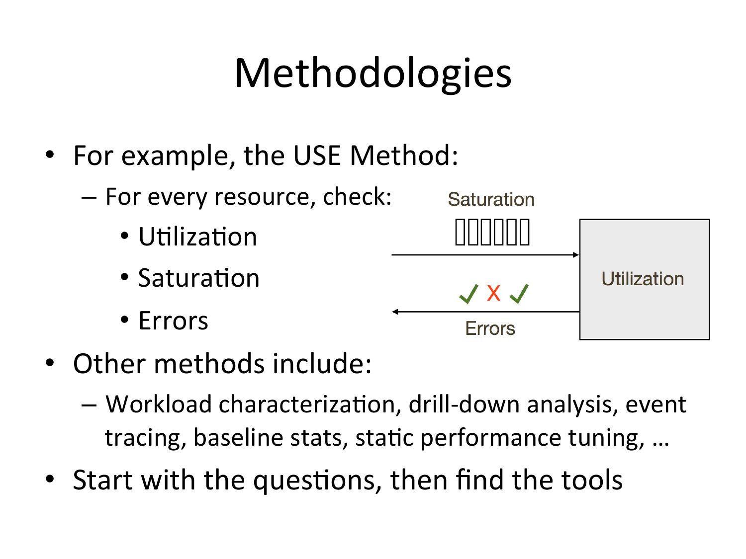 Methodologies • For example, the USE Method: – For every resource, check: • UVlizaVon • SaturaVon • Errors • Other methods include: – Workload characterizaVon, drill-‐down analysis, event tracing, baseline stats, staVc performance tuning, … • Start with the quesVons, then find the toolsslide 10:
