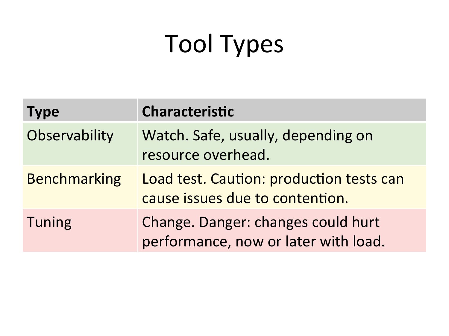 Tool Types Type Observability Benchmarking Tuning Characteris.c Watch. Safe, usually, depending on resource overhead. Load test. CauVon: producVon tests can cause issues due to contenVon. Change. Danger: changes could hurt performance, now or later with load.slide 12: