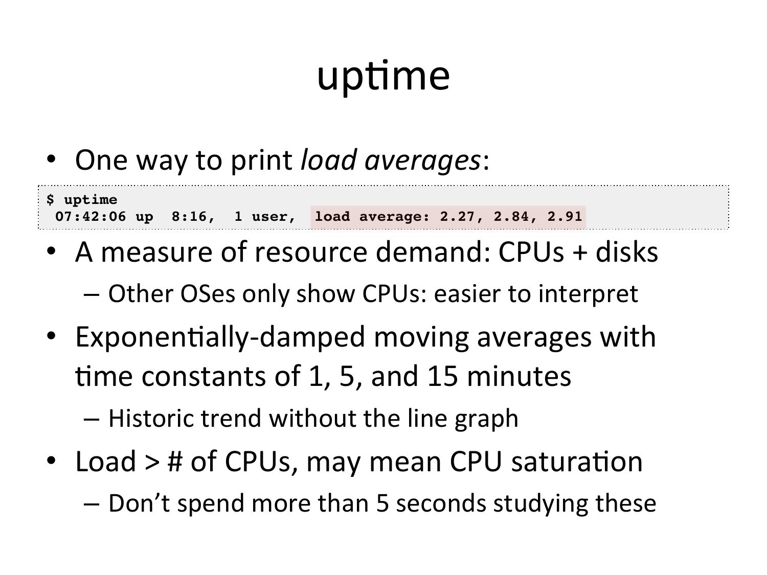 upVme • One way to print load averages: $ uptime! 07:42:06 up 8:16, 1 user, load average: 2.27, 2.84, 2.91! • A measure of resource demand: CPUs + disks – Other OSes only show CPUs: easier to interpret • ExponenVally-‐damped moving averages with Vme constants of 1, 5, and 15 minutes – Historic trend without the line graph • Load >gt; # of CPUs, may mean CPU saturaVon – Don’t spend more than 5 seconds studying theseslide 16: