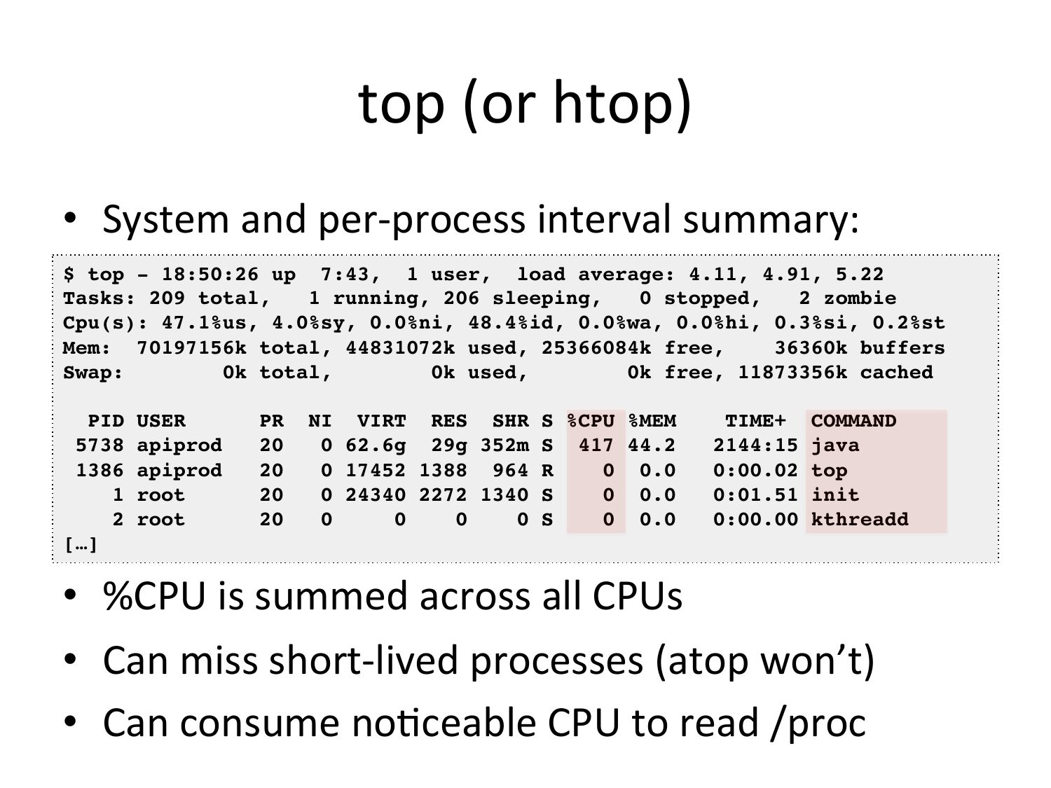 top (or htop) • System and per-‐process interval summary: $ top - 18:50:26 up 7:43, 1 user, load average: 4.11, 4.91, 5.22! Tasks: 209 total, 1 running, 206 sleeping, 0 stopped, 2 zombie! Cpu(s): 47.1%us, 4.0%sy, 0.0%ni, 48.4%id, 0.0%wa, 0.0%hi, 0.3%si, 0.2%st! Mem: 70197156k total, 44831072k used, 25366084k free, 36360k buffers! Swap: 0k total, 0k used, 0k free, 11873356k cached! PID USER PR NI VIRT RES SHR S %CPU %MEM TIME+ COMMAND 5738 apiprod 0 62.6g 29g 352m S 417 44.2 2144:15 java 1386 apiprod 0 17452 1388 964 R 0 0.0 0:00.02 top 1 root 0 24340 2272 1340 S 0 0.0 0:01.51 init 2 root 0 S 0 0.0 0:00.00 kthreadd […]! • %CPU is summed across all CPUs • Can miss short-‐lived processes (atop won’t) • Can consume noVceable CPU to read /procslide 17: