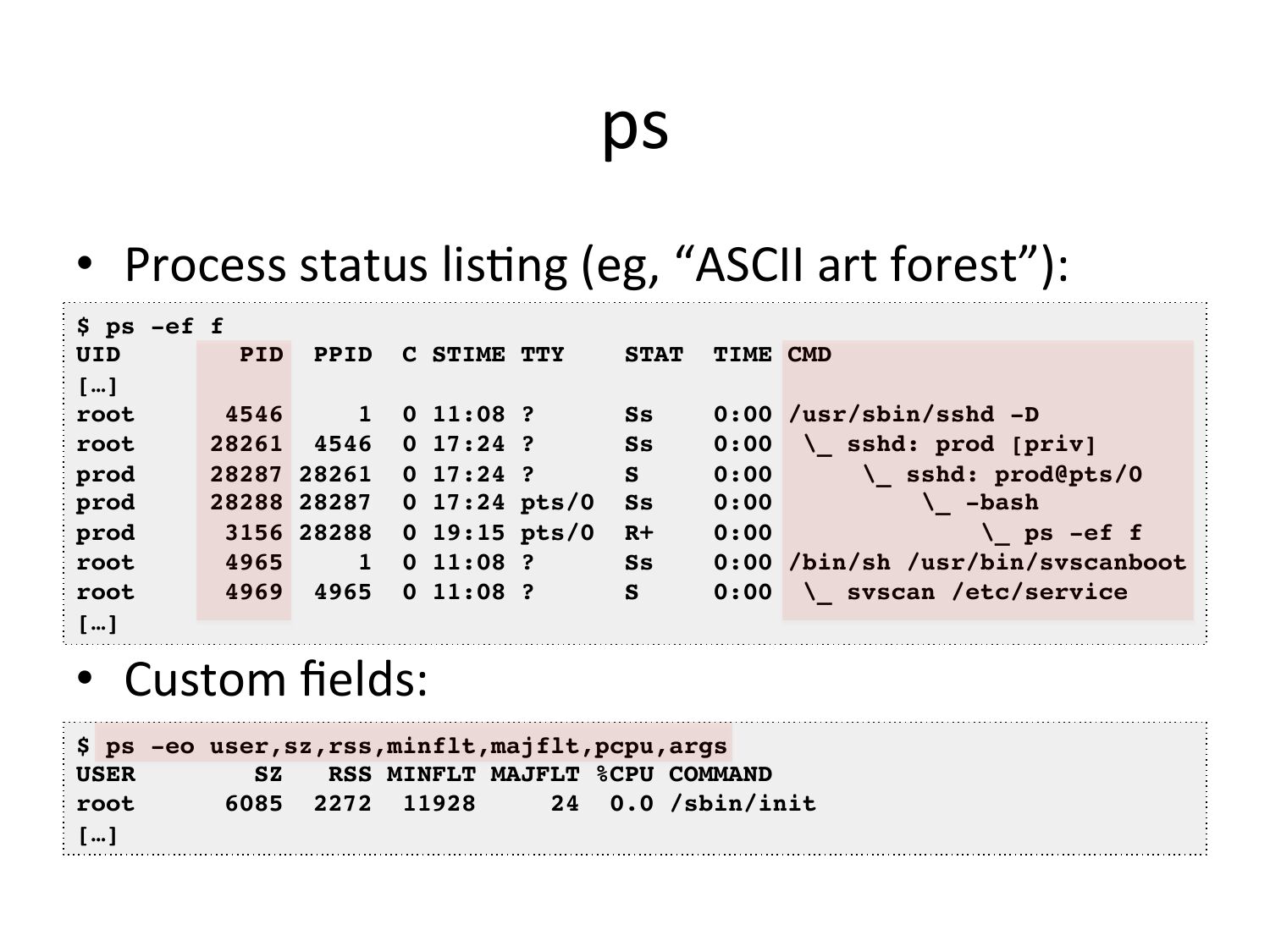 ps • Process status lisVng (eg, “ASCII art forest”): $ ps -ef f! UID PID PPID […]! root root 28261 4546 prod 28287 28261 prod 28288 28287 prod 3156 28288 root root 4969 4965 […]! C STIME TTY STAT TIME CMD! 0 11:08 ? 0 17:24 ? 0 17:24 ? 0 17:24 pts/0 0 19:15 pts/0 0 11:08 ? 0 11:08 ? 0:00 /usr/sbin/sshd -D! 0:00 \_ sshd: prod [priv]! 0:00 \_ sshd: prod@pts/0 ! 0:00 \_ -bash! 0:00 \_ ps -ef f! 0:00 /bin/sh /usr/bin/svscanboot! 0:00 \_ svscan /etc/service! • Custom fields: $ ps -eo user,sz,rss,minflt,majflt,pcpu,args! USER RSS MINFLT MAJFLT %CPU COMMAND! root 6085 2272 11928 24 0.0 /sbin/init! […]!slide 19: