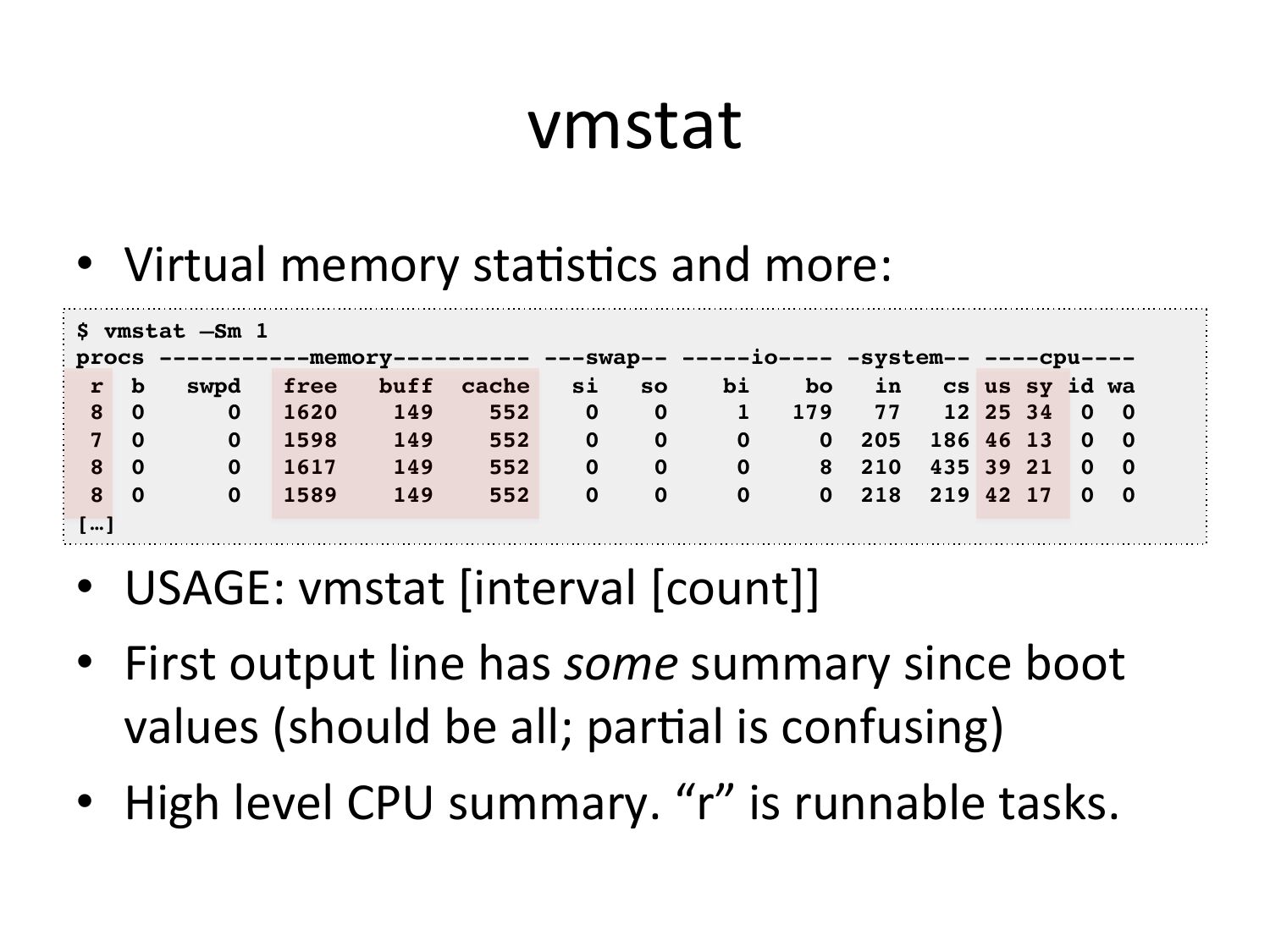 vmstat • Virtual memory staVsVcs and more: $ vmstat –Sm 1! procs -----------memory---------- ---swap-- -----io---- -system-- ----cpu----! r b swpd free buff cache cs us sy id wa! 8 0 12 25 34 0 0! 7 0 0 205 186 46 13 0 0! 8 0 8 210 435 39 21 0 0! 8 0 0 218 219 42 17 0 0! […]! • USAGE: vmstat [interval [count]] • First output line has some summary since boot values (should be all; parVal is confusing) • High level CPU summary. “r” is runnable tasks.slide 20: