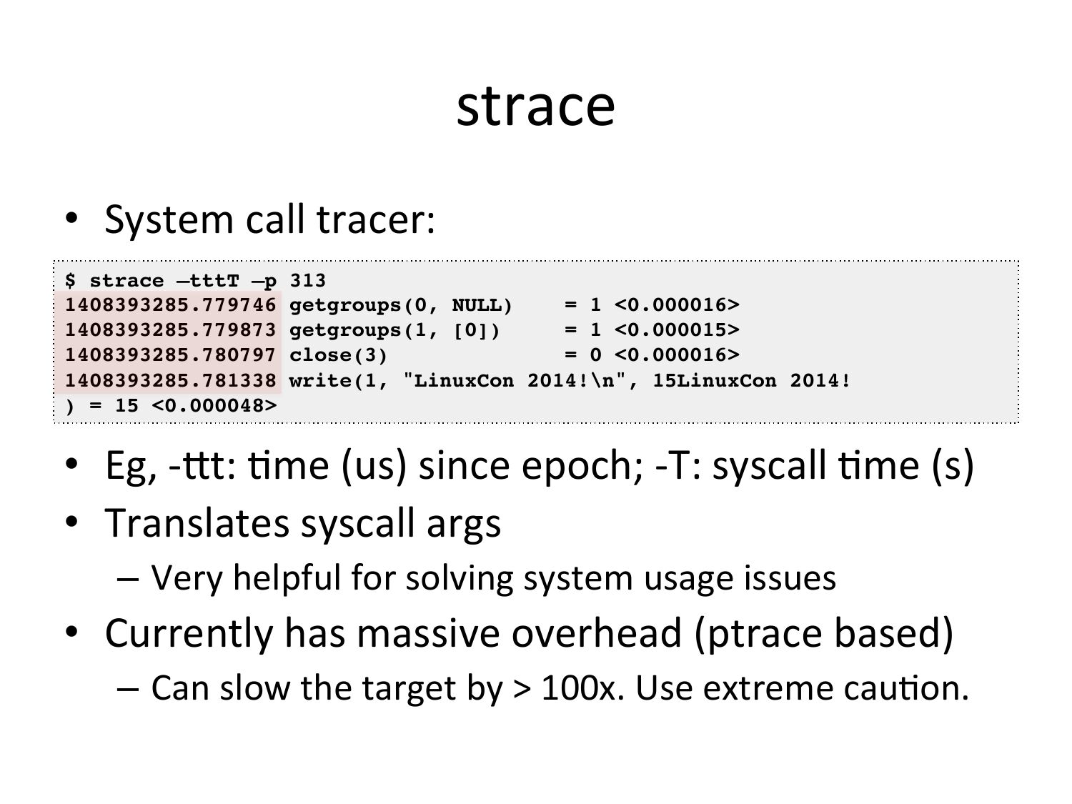 strace • System call tracer: $ strace –tttT –p 313! 1408393285.779746 getgroups(0, NULL) = 1slide 26:gt;! 1408393285.779873 getgroups(1, [0]) = 1 gt;! 1408393285.780797 close(3) = 0 gt;! 1408393285.781338 write(1, "LinuxCon 2014!\n", 15LinuxCon 2014!! ) = 15 gt;! • Eg, -‐kt: Vme (us) since epoch; -‐T: syscall Vme (s) • Translates syscall args – Very helpful for solving system usage issues • Currently has massive overhead (ptrace based) – Can slow the target by >gt; 100x. Use extreme cauVon.