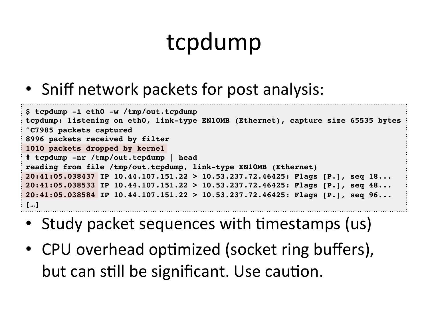 tcpdump • Sniff network packets for post analysis: $ tcpdump -i eth0 -w /tmp/out.tcpdump! tcpdump: listening on eth0, link-type EN10MB (Ethernet), capture size 65535 bytes! ^C7985 packets captured! 8996 packets received by filter! 1010 packets dropped by kernel! # tcpdump -nr /tmp/out.tcpdump | head reading from file /tmp/out.tcpdump, link-type EN10MB (Ethernet) 20:41:05.038437 IP 10.44.107.151.22 >gt; 10.53.237.72.46425: Flags [P.], seq 18...! 20:41:05.038533 IP 10.44.107.151.22 >gt; 10.53.237.72.46425: Flags [P.], seq 48...! 20:41:05.038584 IP 10.44.107.151.22 >gt; 10.53.237.72.46425: Flags [P.], seq 96...! […]! • Study packet sequences with Vmestamps (us) • CPU overhead opVmized (socket ring buffers), but can sVll be significant. Use cauVon.slide 27: