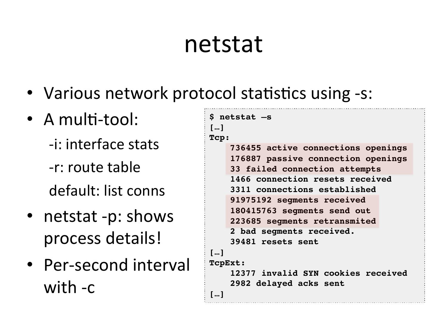 netstat • Various network protocol staVsVcs using -‐s: $ netstat –s! • A mulV-‐tool: […]! -‐i: interface stats -‐r: route table default: list conns • netstat -‐p: shows process details! • Per-‐second interval with -‐c Tcp:! 736455 active connections openings! 176887 passive connection openings! 33 failed connection attempts! 1466 connection resets received! 3311 connections established! 91975192 segments received! 180415763 segments send out! 223685 segments retransmited! 2 bad segments received.! 39481 resets sent! […]! TcpExt:! 12377 invalid SYN cookies received! 2982 delayed acks sent! […]!slide 28: