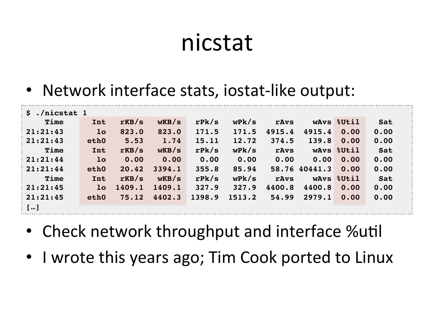 nicstat • Network interface stats, iostat-‐like output: $ ./nicstat 1! Time Int 21:21:43 21:21:43 eth0 Time Int 21:21:44 21:21:44 eth0 Time Int 21:21:45 21:21:45 eth0 […]! rKB/s rKB/s rKB/s wKB/s wKB/s wKB/s rPk/s rPk/s rPk/s wPk/s wPk/s wPk/s rAvs wAvs %Util 4915.4 4915.4 0.00 139.8 0.00 rAvs wAvs %Util 0.00 0.00 58.76 40441.3 0.00 rAvs wAvs %Util 4400.8 4400.8 0.00 54.99 2979.1 0.00 Sat! 0.00! 0.00! Sat! 0.00! 0.00! Sat! 0.00! 0.00! • Check network throughput and interface %uVl • I wrote this years ago; Tim Cook ported to Linuxslide 29: