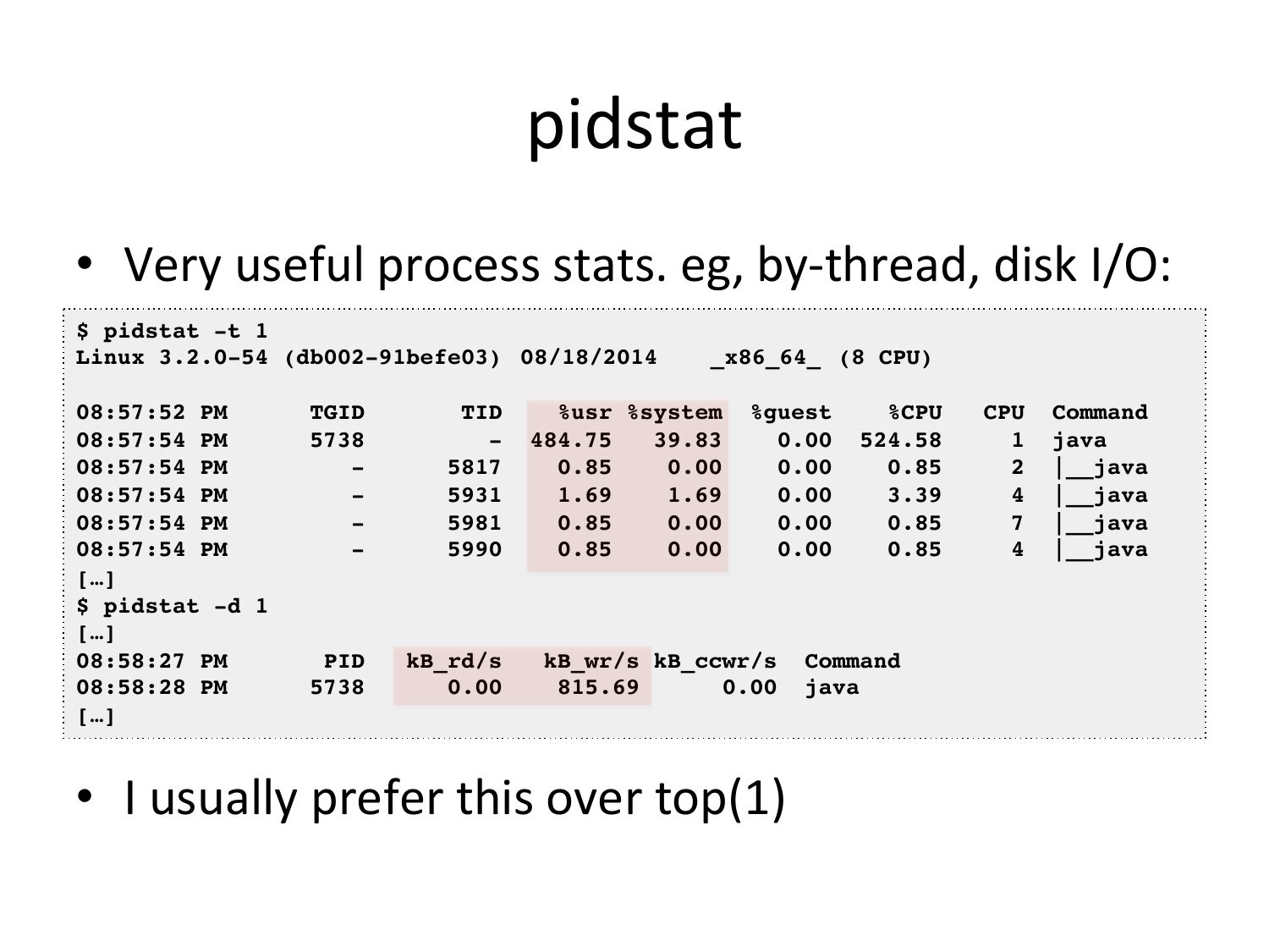 pidstat • Very useful process stats. eg, by-‐thread, disk I/O: $ pidstat -t 1! Linux 3.2.0-54 (db002-91befe03) !08/18/2014 !_x86_64_ !(8 CPU)! 08:57:52 PM TGID TID %usr %system %guest %CPU 08:57:54 PM - 484.75 0.00 524.58 08:57:54 PM 08:57:54 PM 08:57:54 PM 08:57:54 PM […]! $ pidstat -d 1! […]! 08:58:27 PM PID kB_rd/s kB_wr/s kB_ccwr/s Command! 08:58:28 PM 0.00 java! […]! • I usually prefer this over top(1) CPU Command! java! |__java! |__java! |__java! |__java!slide 30: