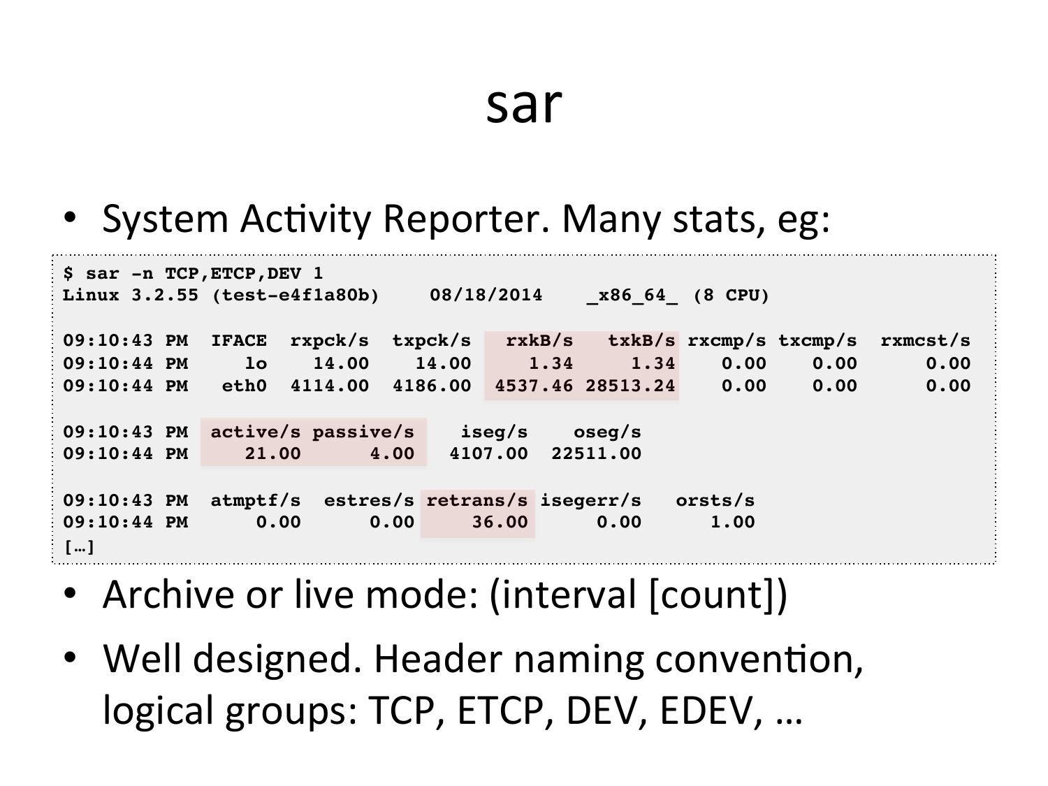 sar • System AcVvity Reporter. Many stats, eg: $ sar -n TCP,ETCP,DEV 1! Linux 3.2.55 (test-e4f1a80b) !08/18/2014 !_x86_64_ !(8 CPU)! 09:10:43 PM IFACE rxpck/s txpck/s rxkB/s txkB/s rxcmp/s txcmp/s 09:10:44 PM 09:10:44 PM eth0 4114.00 4186.00 4537.46 28513.24 09:10:43 PM active/s passive/s iseg/s oseg/s! 09:10:44 PM 4107.00 22511.00! 09:10:43 PM atmptf/s estres/s retrans/s isegerr/s orsts/s! 09:10:44 PM 1.00! […]! • Archive or live mode: (interval [count]) • Well designed. Header naming convenVon, logical groups: TCP, ETCP, DEV, EDEV, … rxmcst/s! 0.00! 0.00!slide 32: