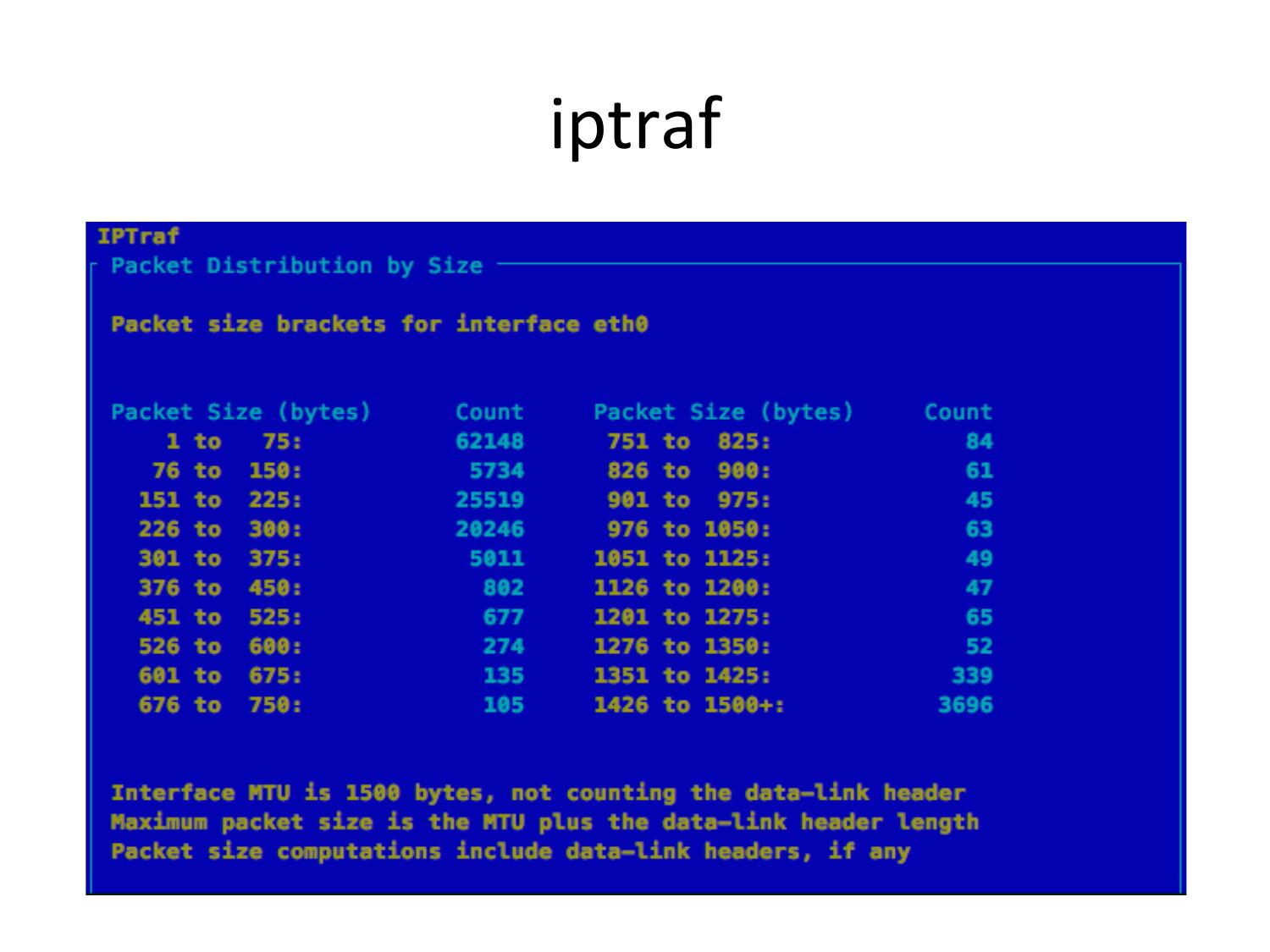 pchar • Traceroute with bandwidth per hop! $ pchar 10.71.83.1! […]! 4: 10.110.80.1 (10.110.80.1)! Partial loss: 0 / 5 (0%)! Partial char: rtt = 9.351109 ms, (b = 0.004961 ms/B), r2 = 0.184105! stddev rtt = 4.967992, stddev b = 0.006029! Partial queueing: avg = 0.000000 ms (0 bytes)! Hop char: rtt = --.--- ms, bw = 1268.975773 Kbps! Hop queueing: avg = 0.000000 ms (0 bytes)! 5: 10.193.43.181 (10.193.43.181)! Partial loss: 0 / 5 (0%)! Partial char: rtt = 25.461597 ms, (b = 0.011934 ms/B), r2 = 0.228707! stddev rtt = 10.426112, stddev b = 0.012653! Partial queueing: avg = 0.000000 ms (0 bytes)! Hop char: rtt = 16.110487 ms, bw = 1147.210397 Kbps! Hop queueing: avg = 0.000000 ms (0 bytes)! […]! • Needs love. Based on pathchar (Linux 2.0.30).slide 55: