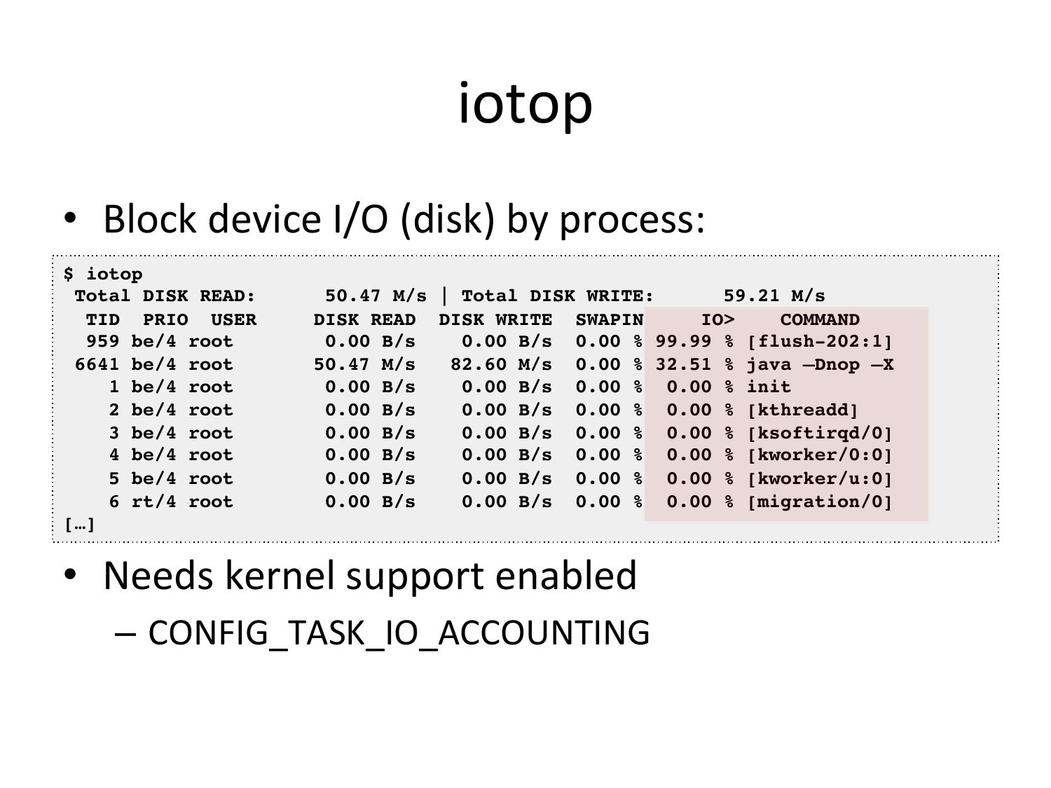 iotop • Block device I/O (disk) by process: $ iotop! Total DISK READ: TID PRIO USER 959 be/4 root 6641 be/4 root 1 be/4 root 2 be/4 root 3 be/4 root 4 be/4 root 5 be/4 root 6 rt/4 root […]! 50.47 M/s | Total DISK WRITE: 59.21 M/s! DISK READ DISK WRITE SWAPIN IO>gt; COMMAND 0.00 B/s 0.00 B/s 0.00 % 99.99 % [flush-202:1]! 50.47 M/s 82.60 M/s 0.00 % 32.51 % java –Dnop –X! 0.00 B/s 0.00 B/s 0.00 % 0.00 % init! 0.00 B/s 0.00 B/s 0.00 % 0.00 % [kthreadd]! 0.00 B/s 0.00 B/s 0.00 % 0.00 % [ksoftirqd/0]! 0.00 B/s 0.00 B/s 0.00 % 0.00 % [kworker/0:0]! 0.00 B/s 0.00 B/s 0.00 % 0.00 % [kworker/u:0]! 0.00 B/s 0.00 B/s 0.00 % 0.00 % [migration/0]! • Needs kernel support enabled – CONFIG_TASK_IO_ACCOUNTINGslide 42: